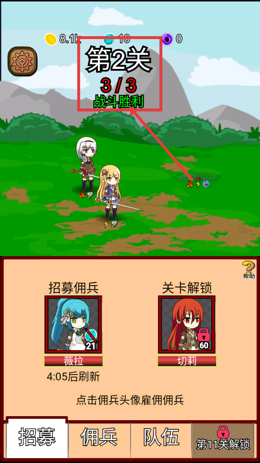 4、【第2关】战斗胜利后,解锁招募佣兵和新关卡,继续推进游戏,提升佣兵队伍战力。