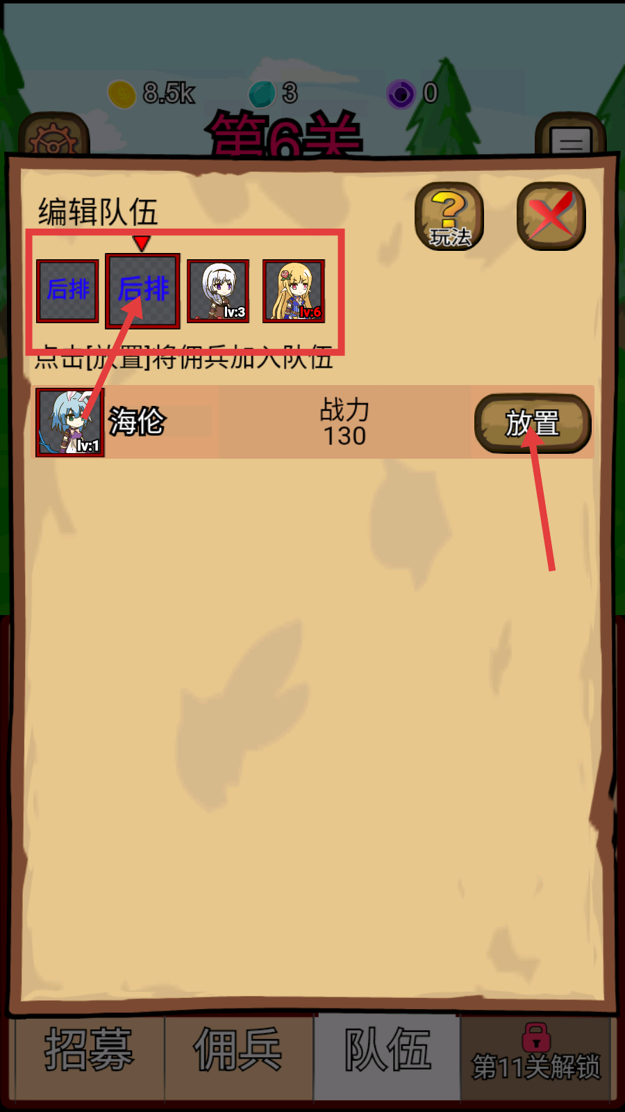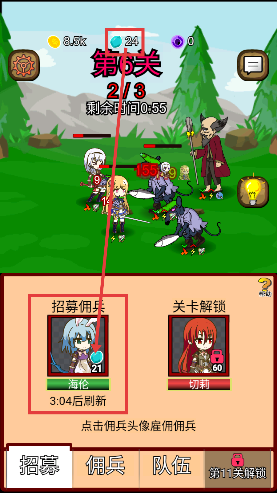 1、在【第6关】战斗时,利用钻石24招募【海伦】佣兵,增强队伍战力,推进关卡进度。