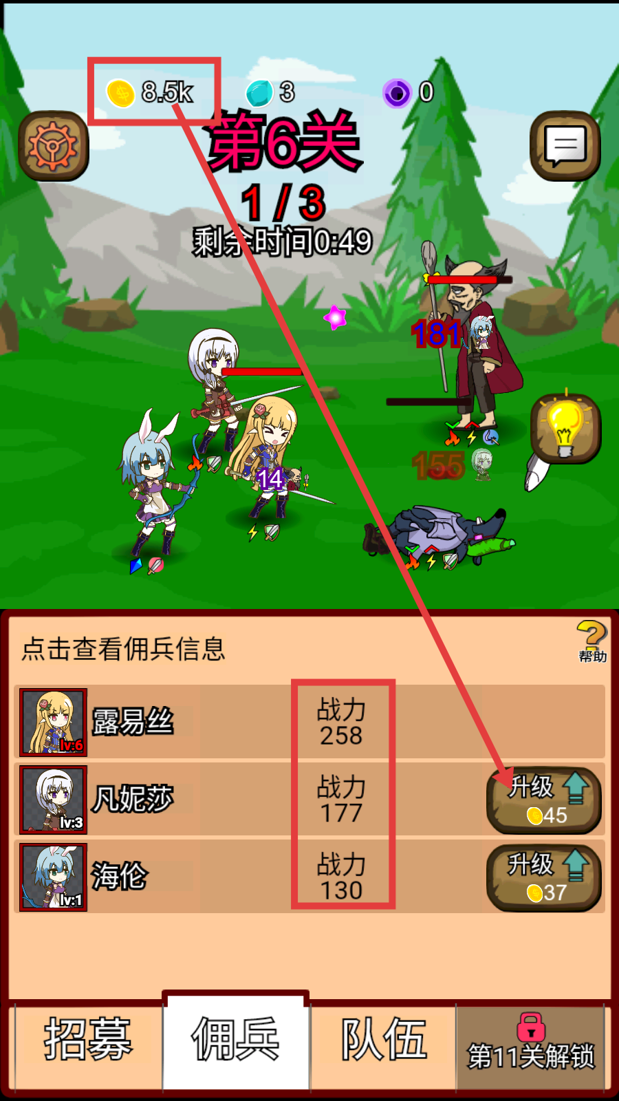 3、消耗金币8.5k升级佣兵,提升【露易丝】【凡妮莎】【海伦】的战力,增强队伍战斗能力。