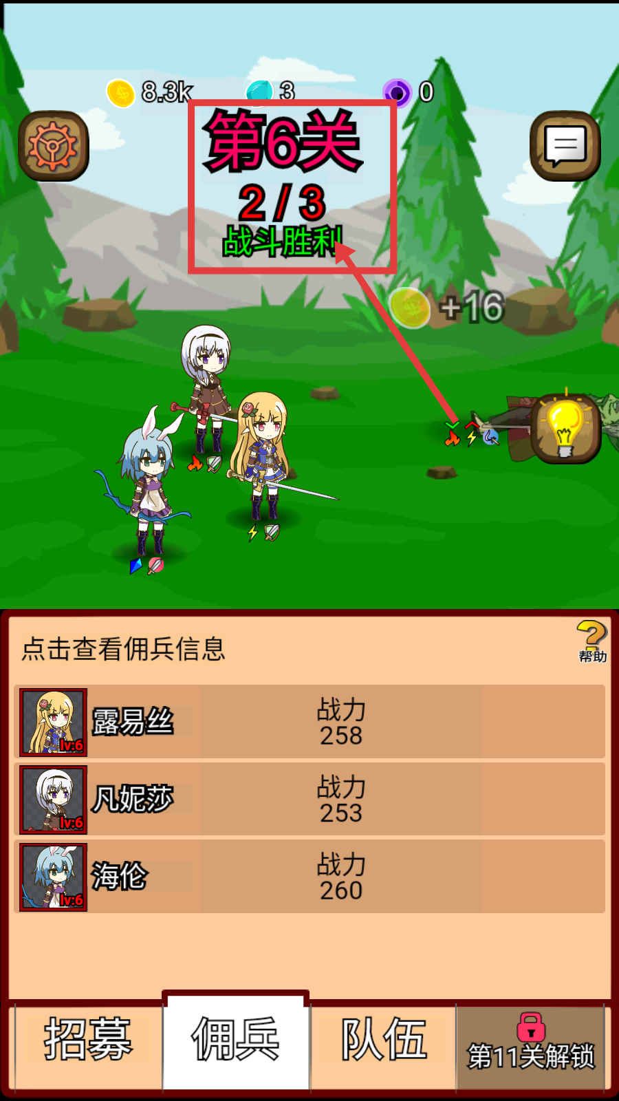 4、在【第6关】战斗胜利后,继续挑战后续关卡,积累资源提升佣兵战力。
