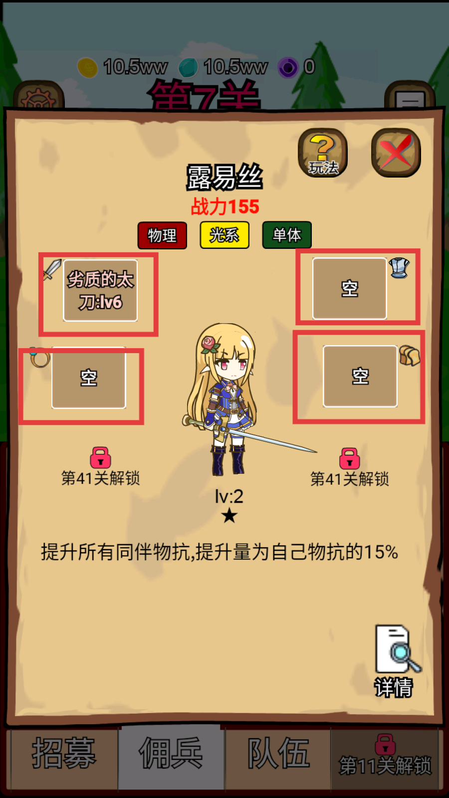 1、查看【露易丝】的【劣质的太刀-lv6】,关注装备栏空缺,后续需收集装备提升战力。