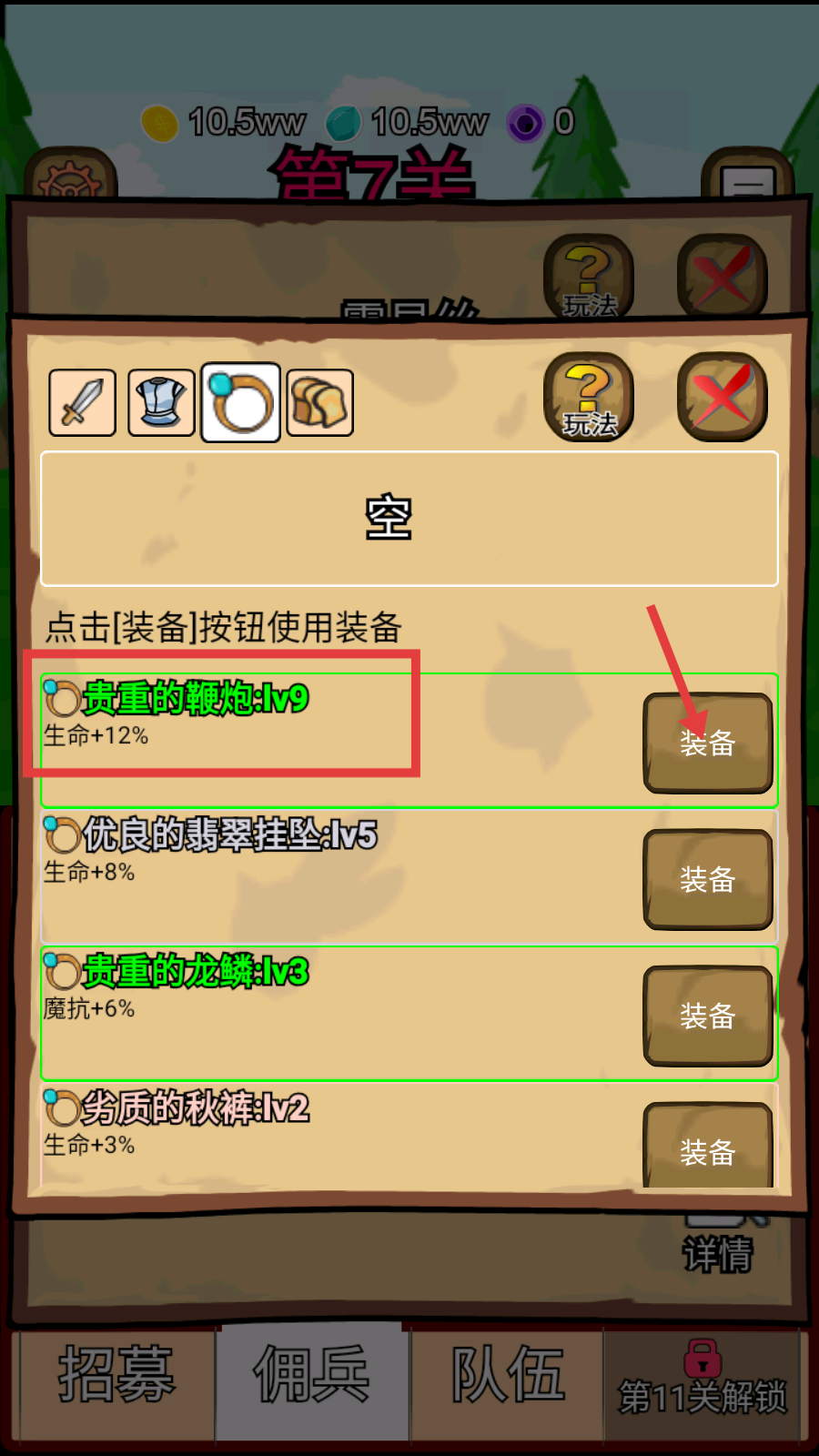 2、点击装备【贵重的鞭炮-lv9】,提升生命属性,增强佣兵战斗能力。