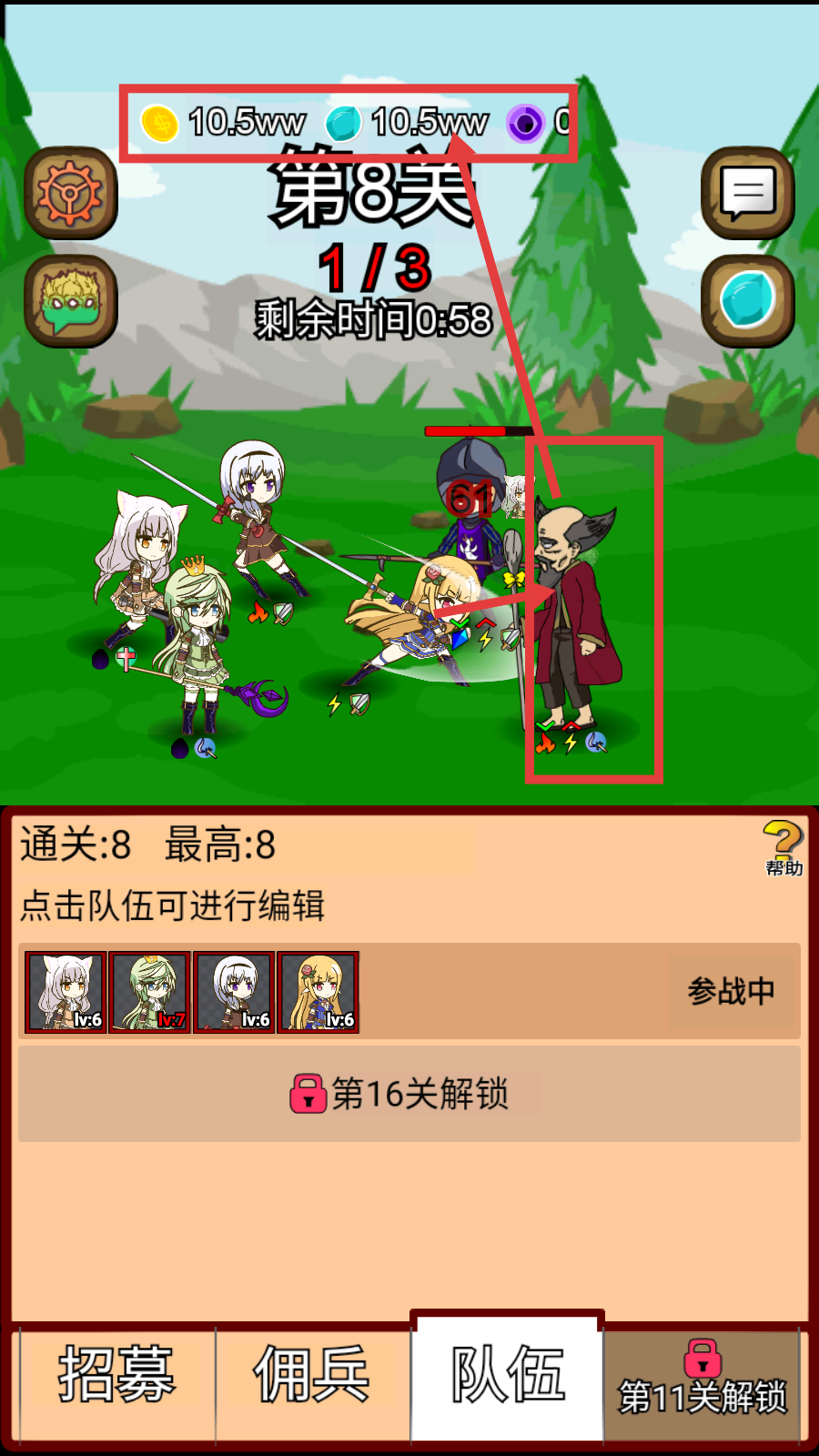 3、在【第8关】战斗中,利用金币10.5ww和钻石10.5ww资源,指挥队伍对战敌人,推进关卡进度。