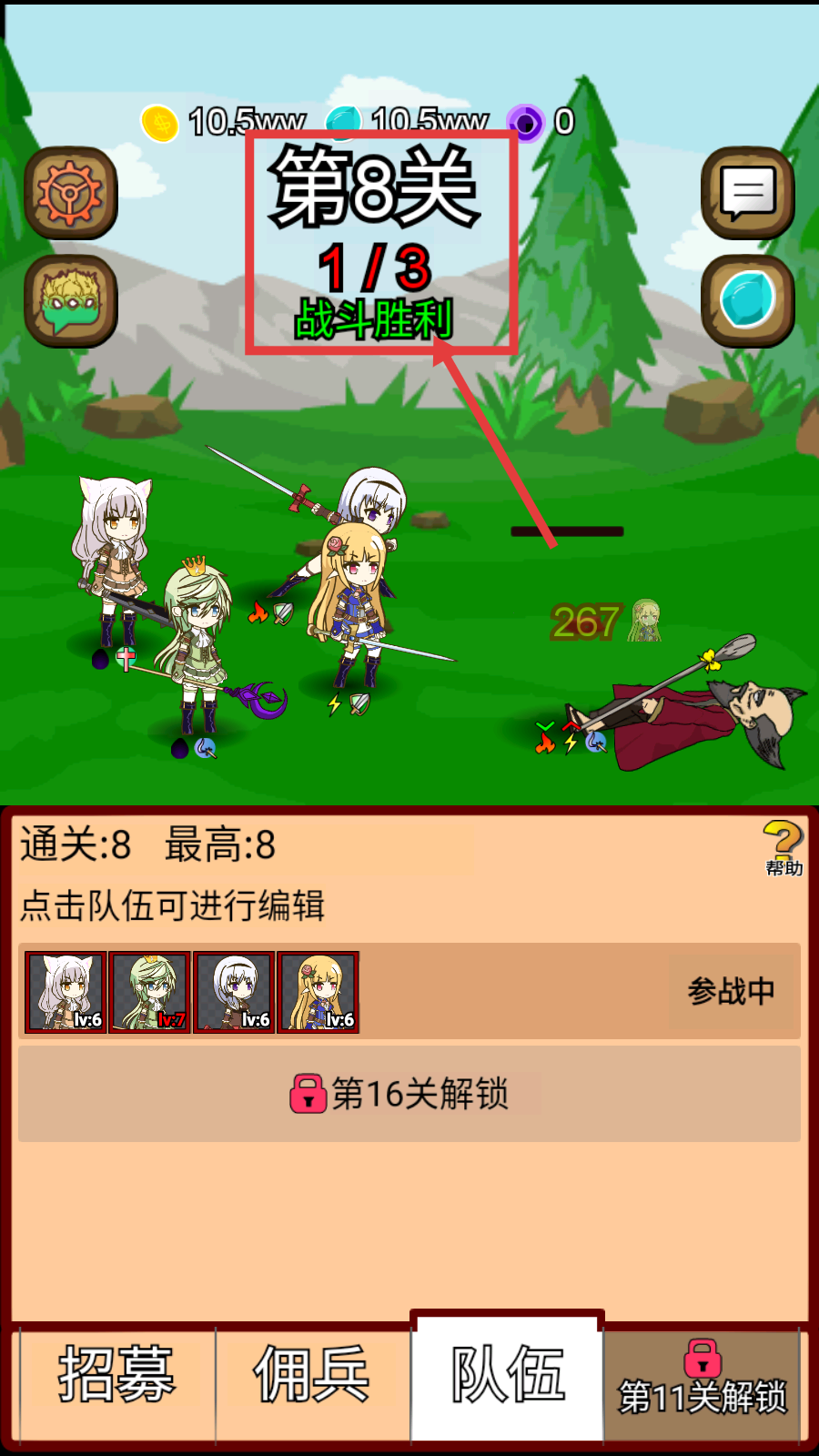 4、【第8关】战斗胜利后,继续挑战后续关卡,积累资源提升佣兵战力和装备等级。