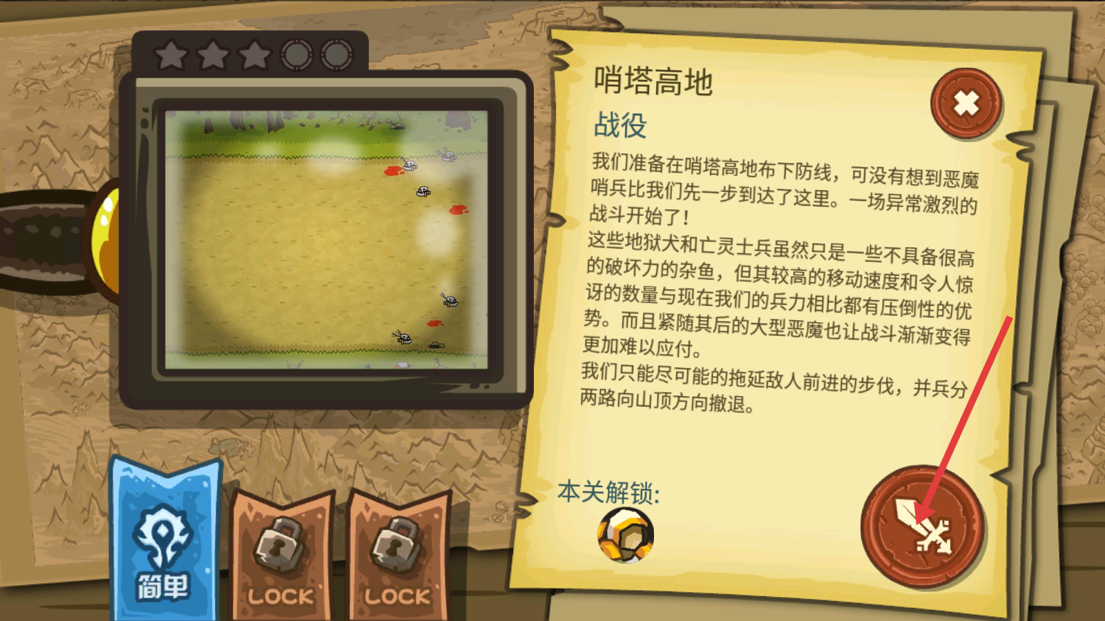 1、选择“哨塔高地”战役,点击红色按钮进入,了解敌方为地狱犬、亡灵士兵及大型恶魔,本关解锁新单位,提前规划战术。