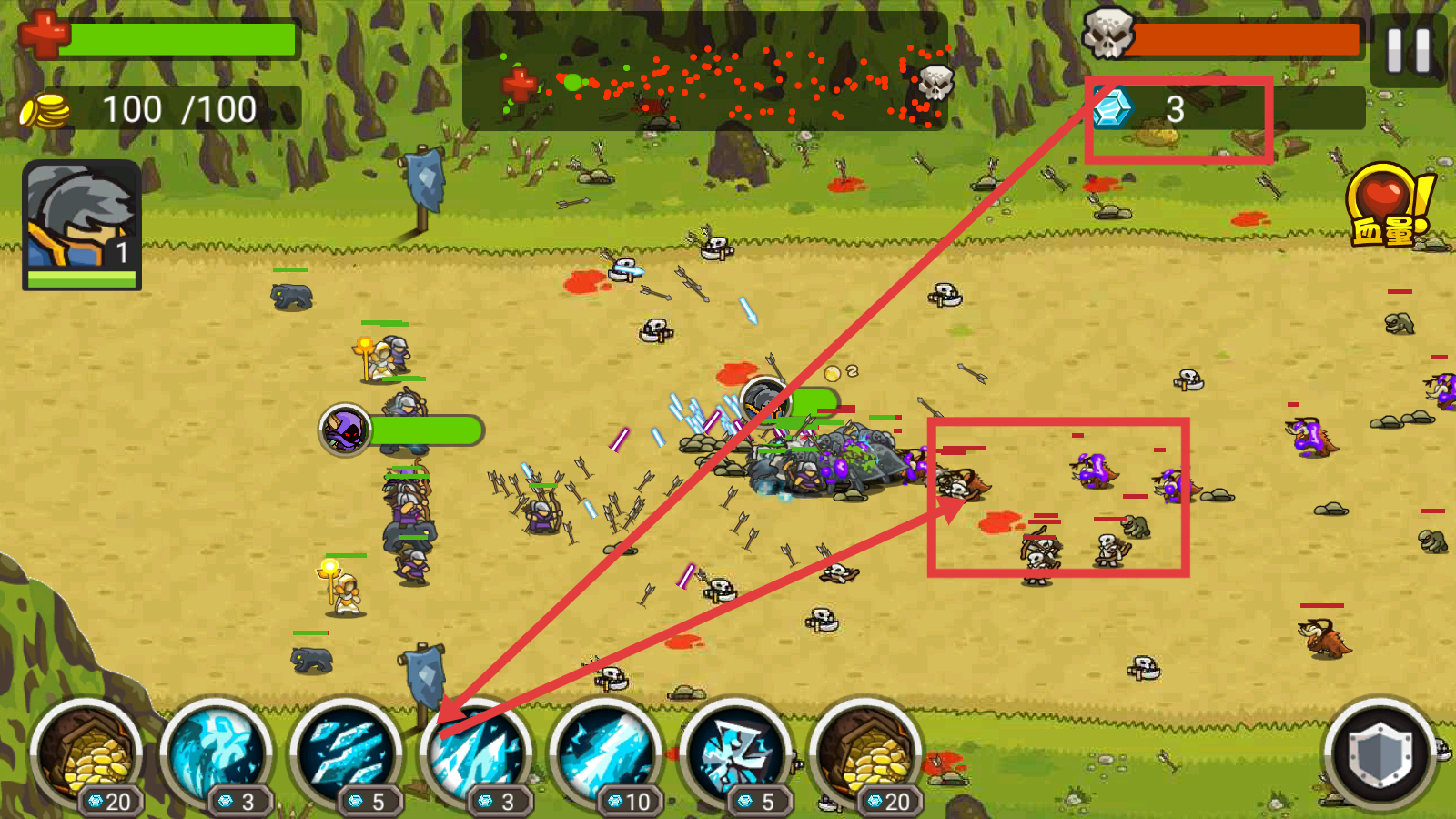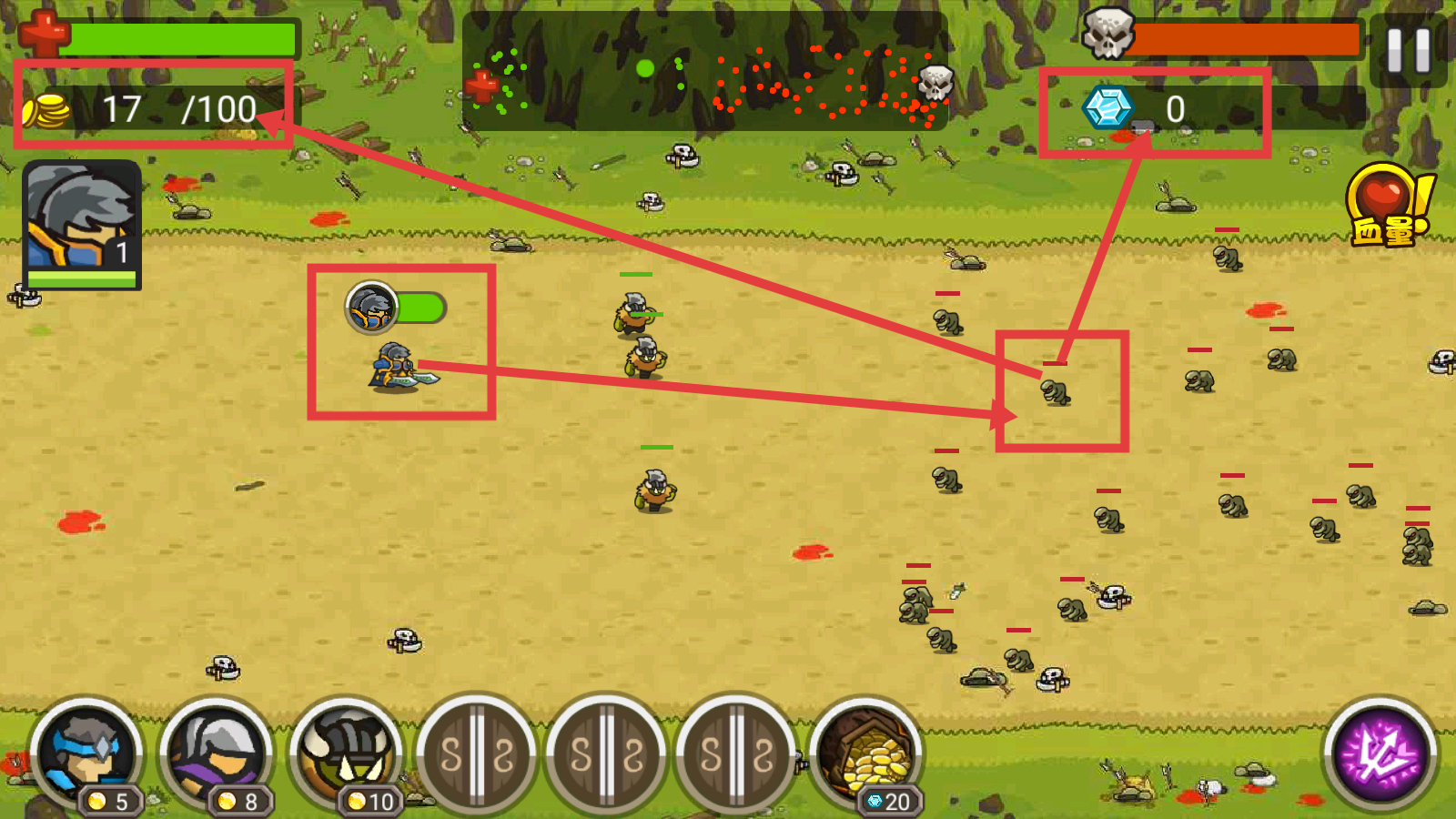 2、战斗中关注金币(如17/100)与钻石资源,花费金币召唤士兵(如5金币士兵),组建防线,抵御敌人进攻。