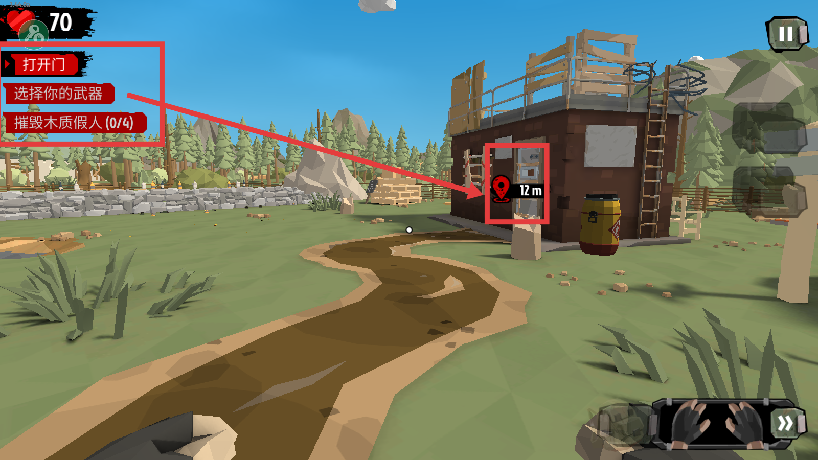 1、明确任务目标,打开门、选择武器、摧毁4个木质假人、攻击4个靶子。前往距离12m的建筑,准备完成任务。