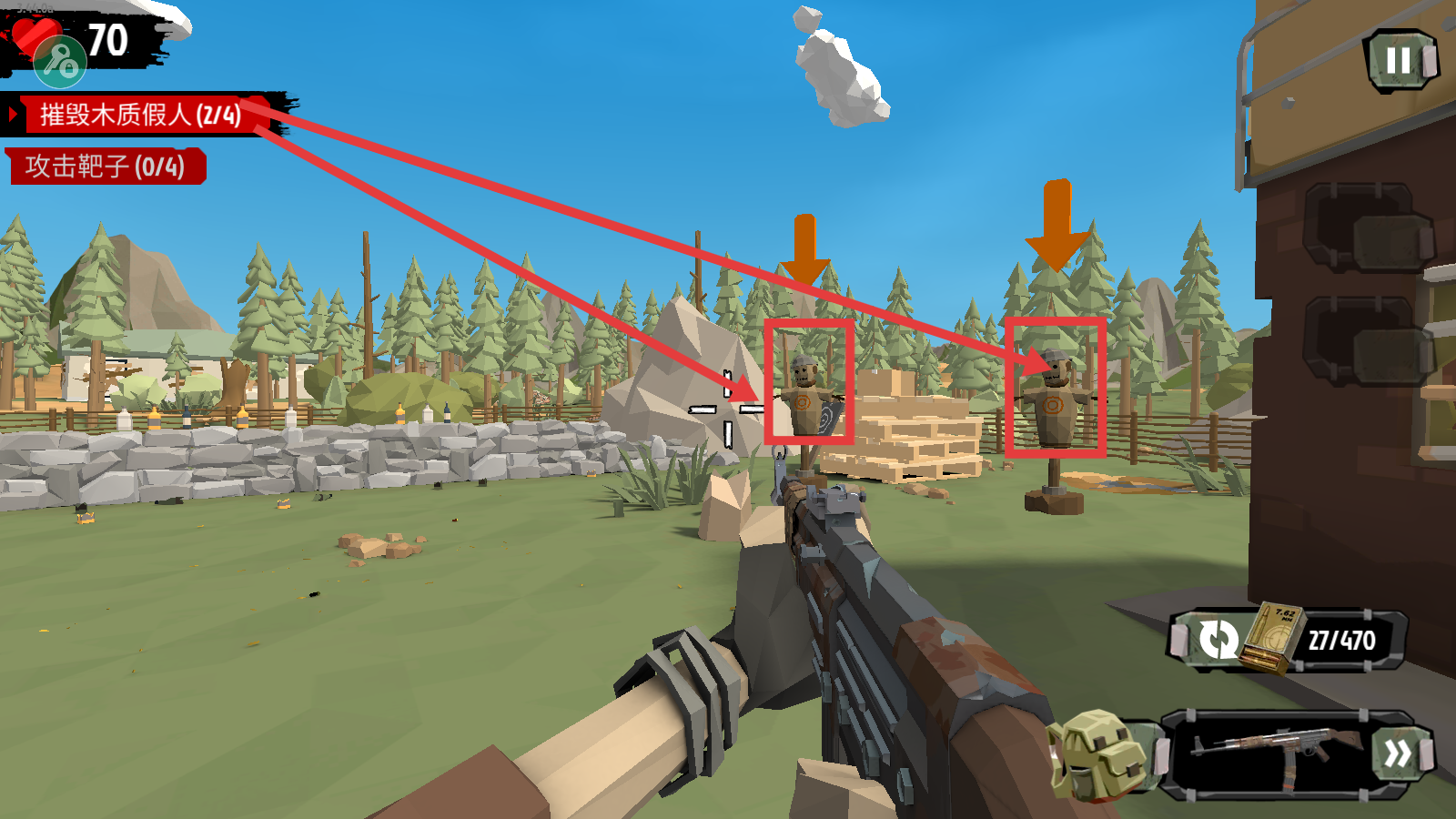 3、使用武器摧毁木质假人,推进任务进度(如2/4),同时攻击靶子,逐步完成所有目标。