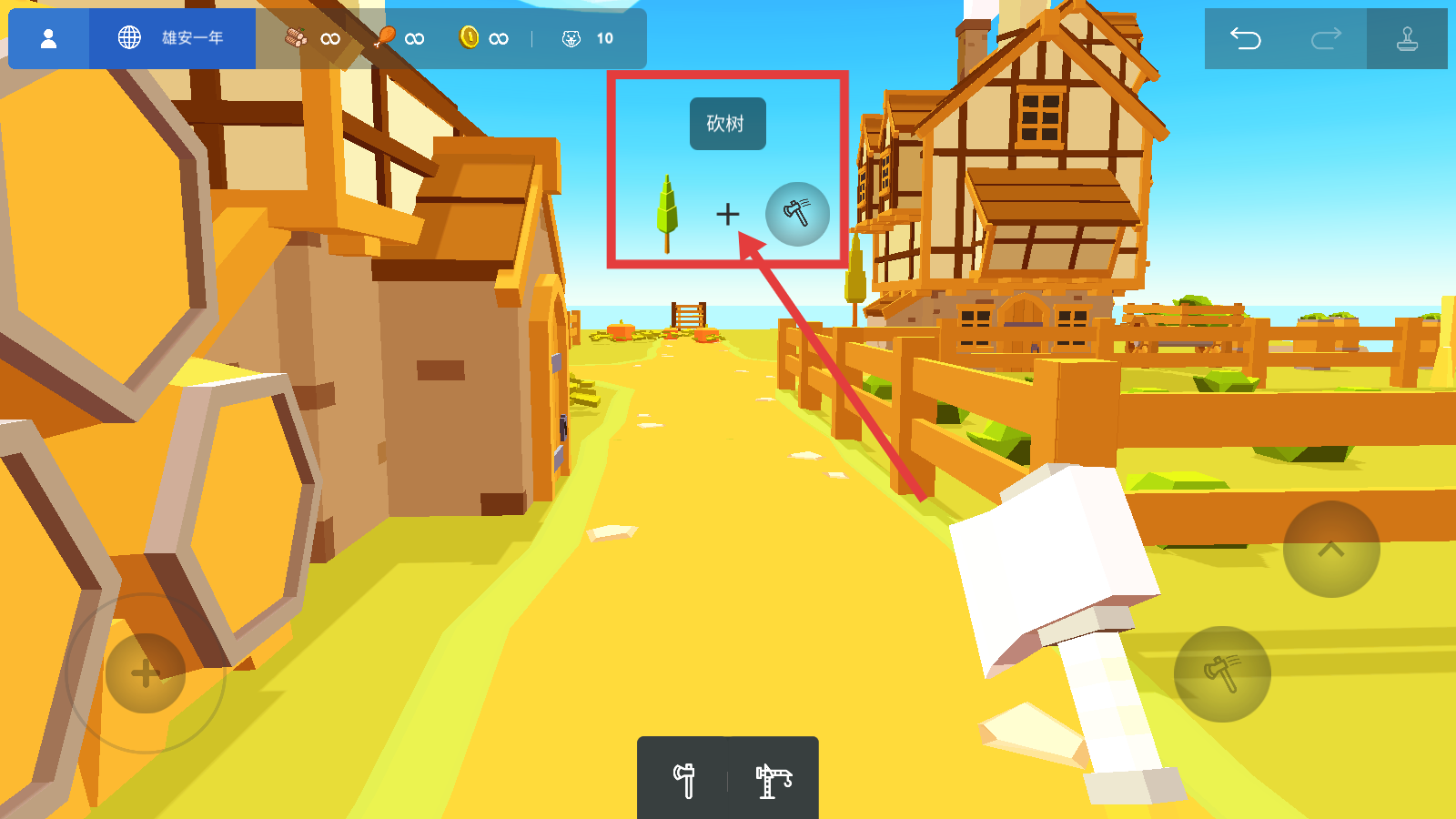 2、接到“砍树”任务,使用斧头工具,瞄准树木发起砍伐操作,启动资源收集进程。