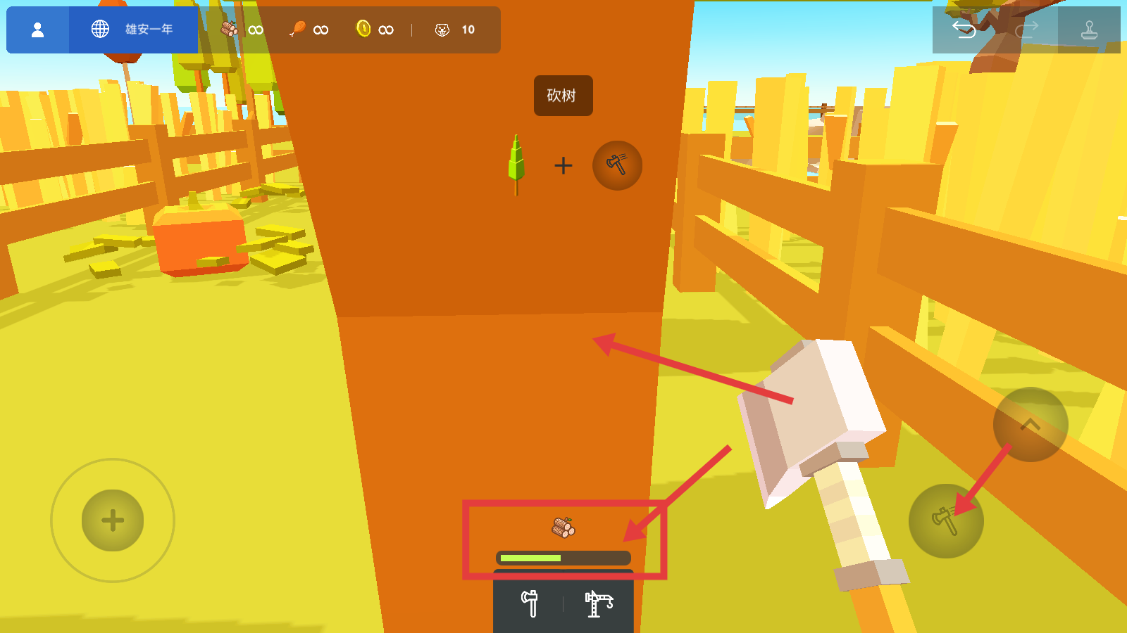 3、砍伐树木时,关注下方进度条,完成砍伐后收集木材资源,积累游戏材料,助力后续发展。