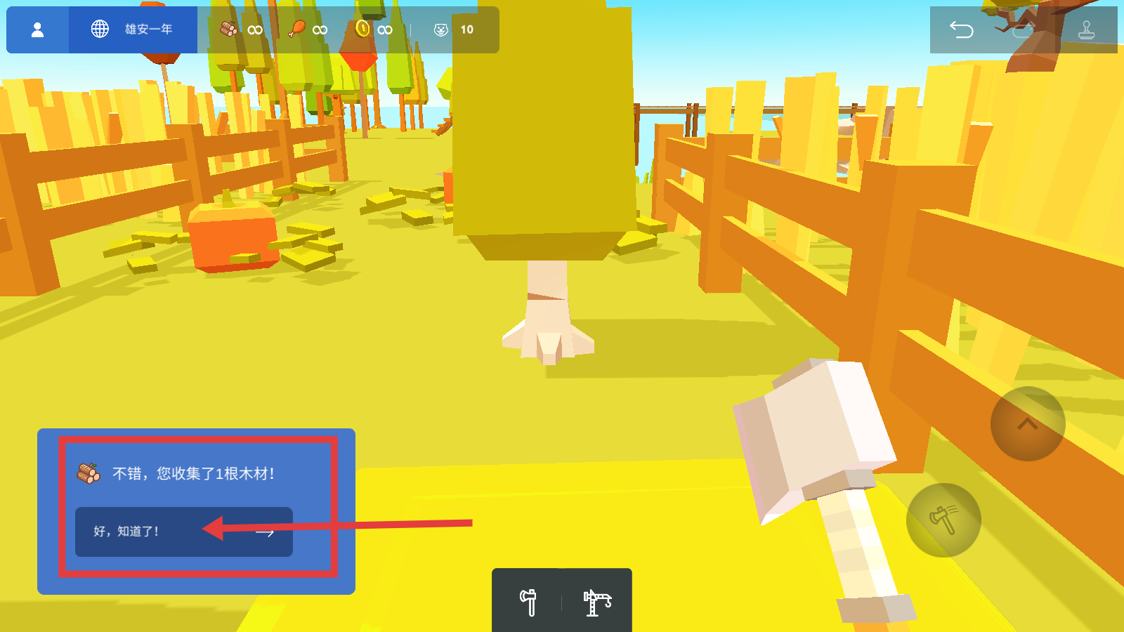 4、成功收集木材后,收到“不错,您收集了1根木材!”的提示,点击“好,知道了!”,完成该阶段资源收集任务,继续探索游戏内容。
