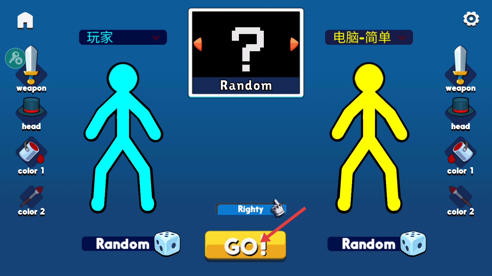 1、对战前可设置【weapon】【head】【color1】【color2】自定义角色,点击【GO!】开始,也可选择【Random】随机匹配。