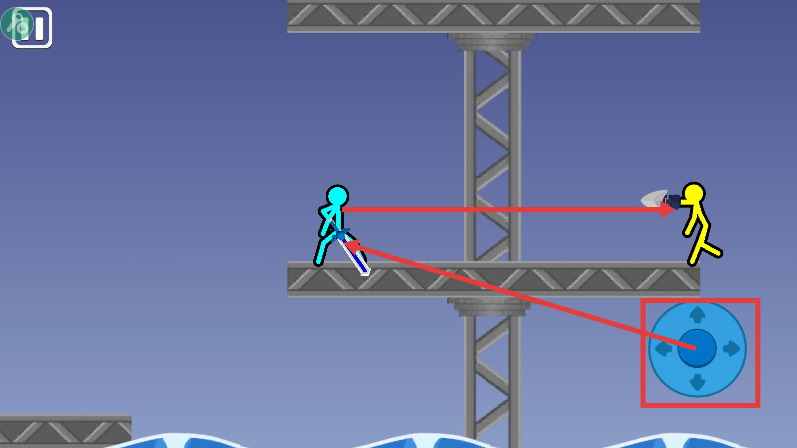2、战斗中利用右下角【方向键】操控角色移动,瞄准敌人发起攻击,同时注意躲避敌方反击。