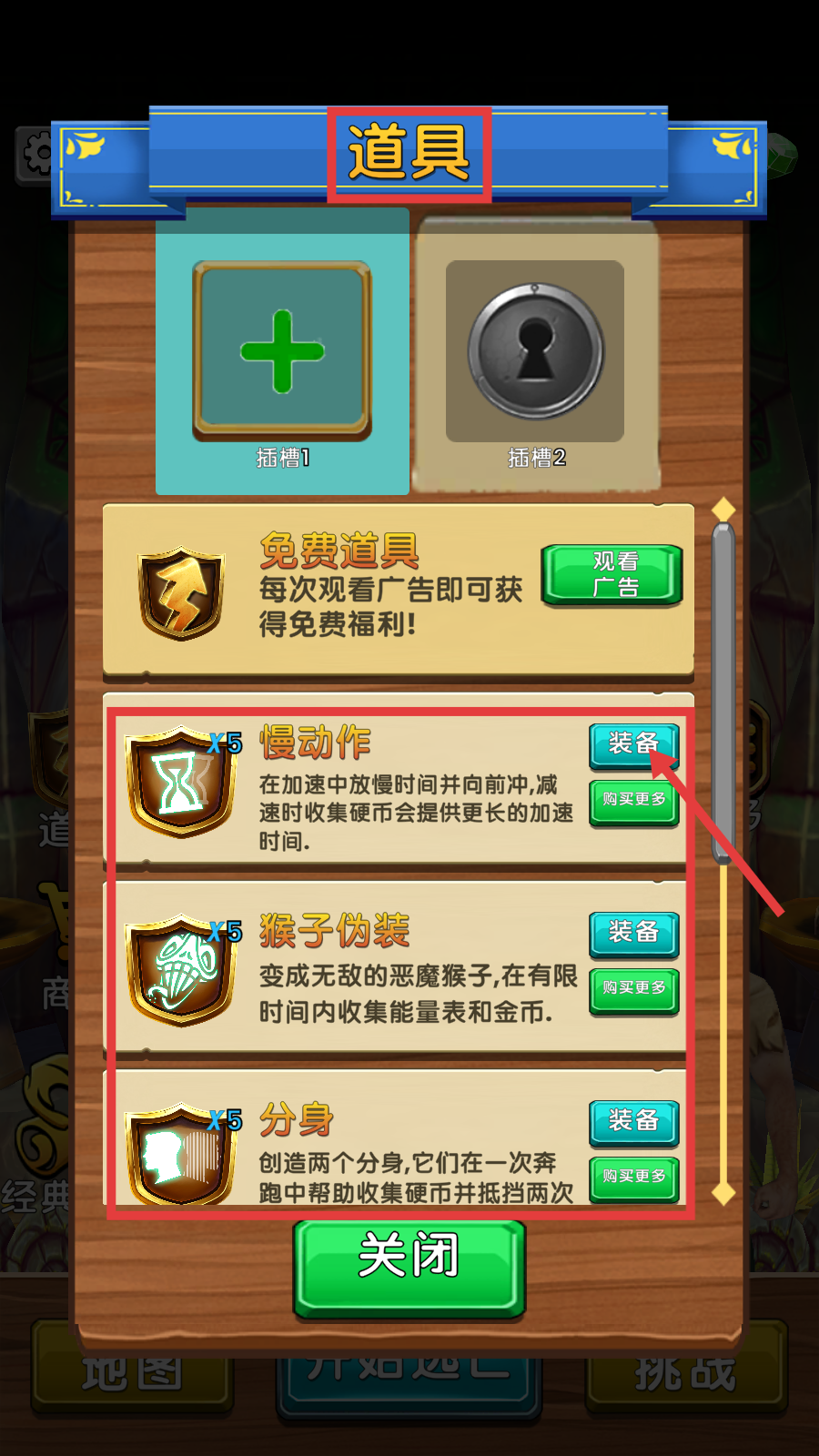 1、进入【道具】界面,可装备【慢动作】【猴子伪装】【分身】等道具,观看广告还能获取免费福利,提升游戏表现。