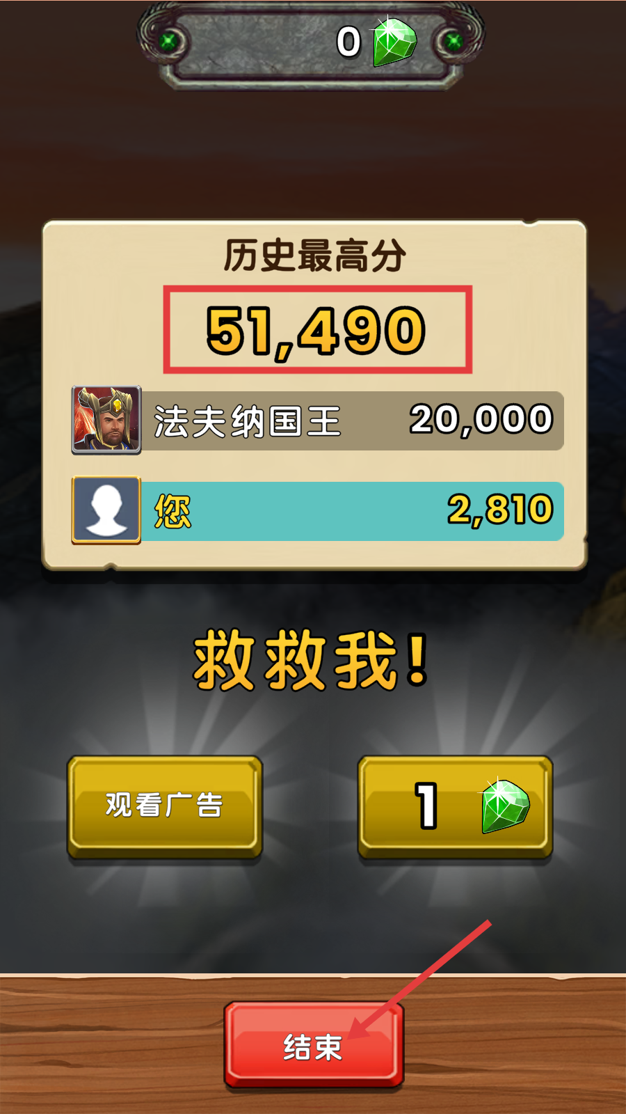 4、游戏结束后查看【历史最高分-51,490】,可选择【结束】结算,也可通过观看广告或消耗钻石继续挑战,争取突破高分。