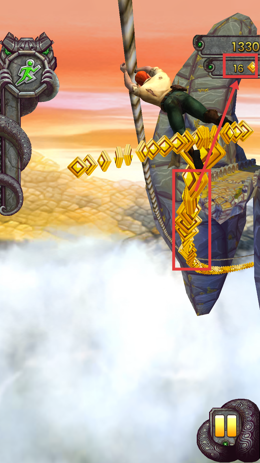 2、攀爬场景中,操控角色收集金币,注意保持攀爬节奏,积累【金币-钻石】资源。