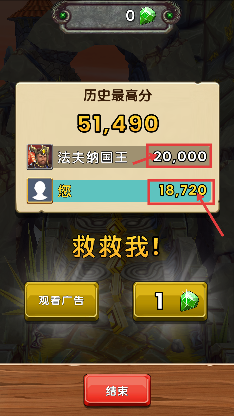 4、游戏结束后查看【历史最高分-51,490】,对比【法夫纳国王-20,000】和自身分数,继续挑战争取突破。