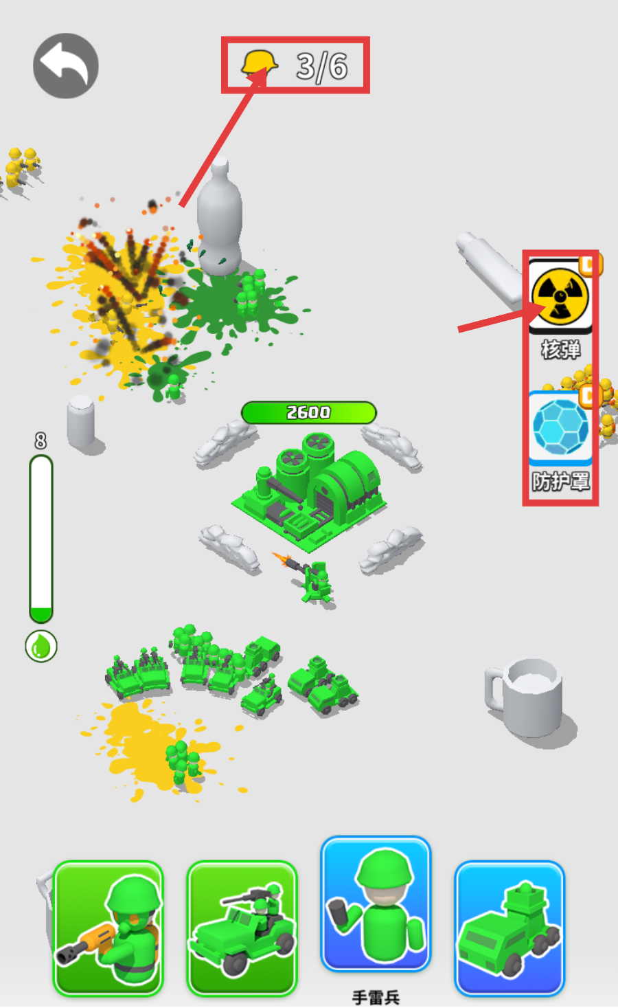 3、关注【头盔-3/6】剩余数量,适时使用【核弹】【防护罩】,应对敌方攻势保障己方生存。