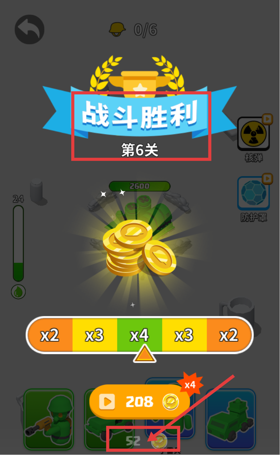 4、获得【战斗胜利-第6关】后,领取【金币-52】奖励,积累资源用于兵种升级或资源获取。