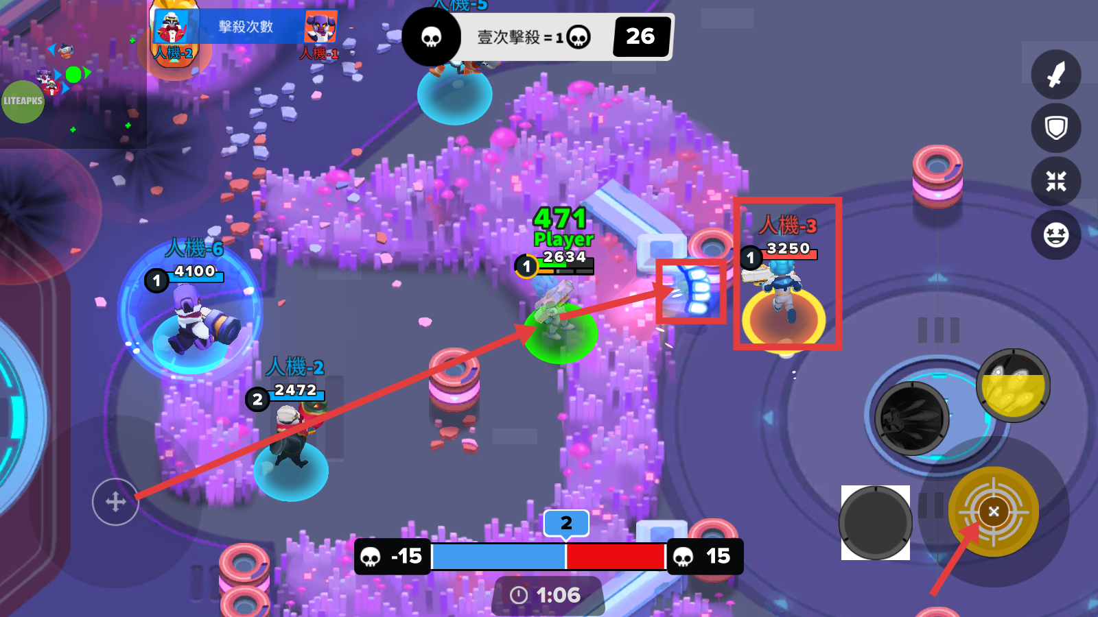 3、战斗中优先拾取如紫色闪电标识的【增益道具】,提升自身战力,更高效地击杀敌人积累积分。