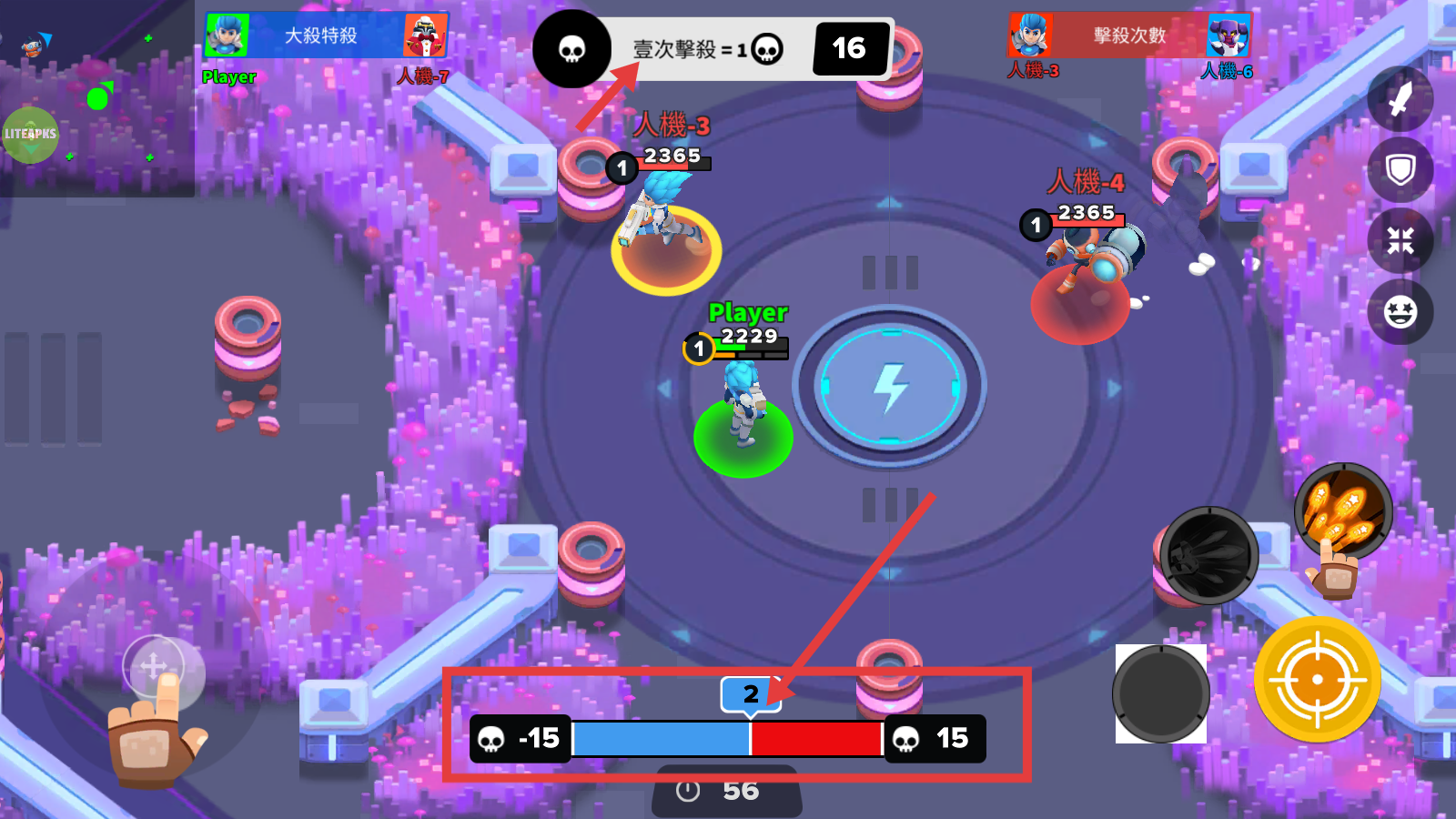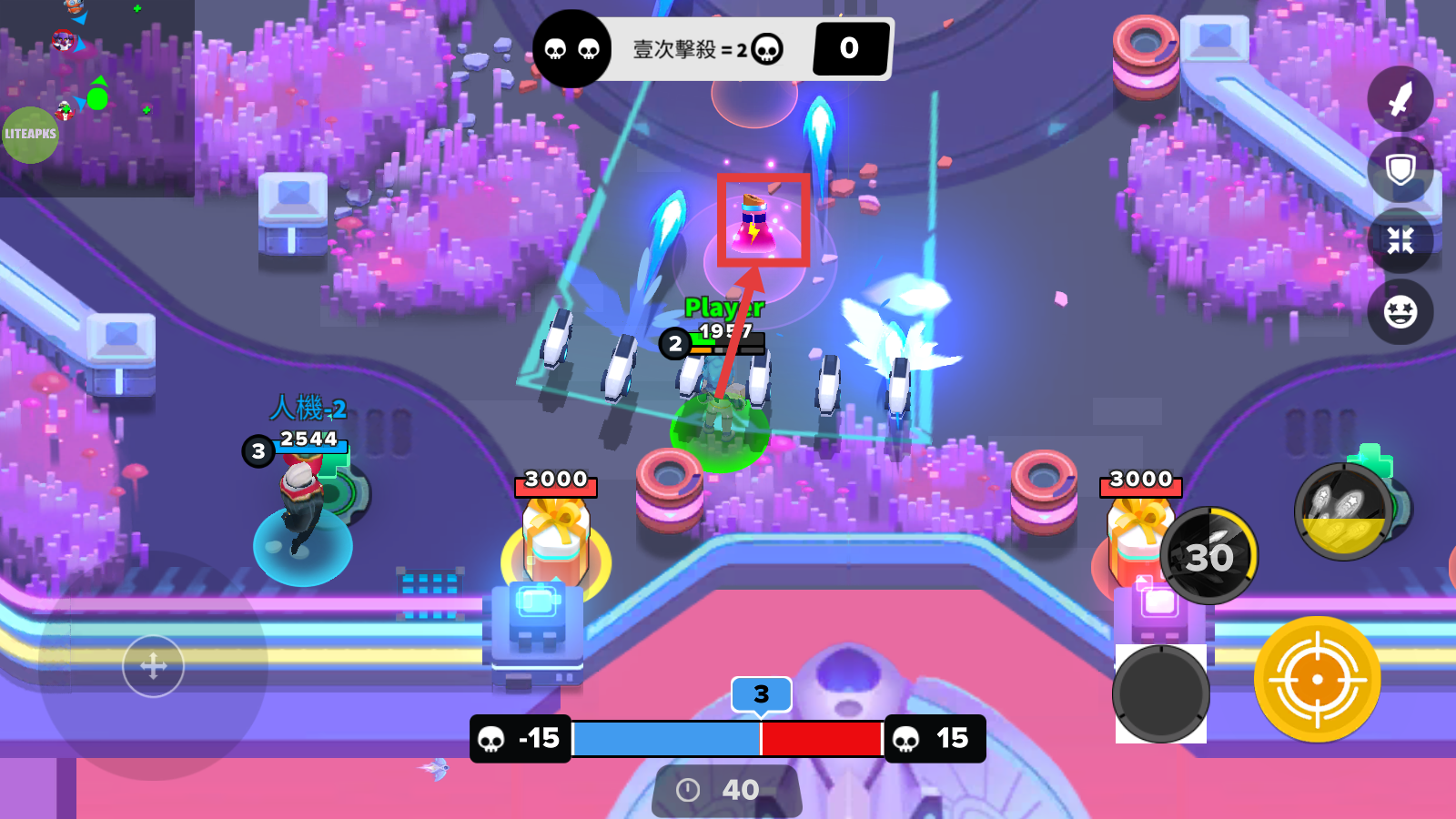 1、利用左侧摇杆控制移动,瞄准【人機-3】等敌方单位,通过右侧攻击按钮发起进攻,积累击杀积分。