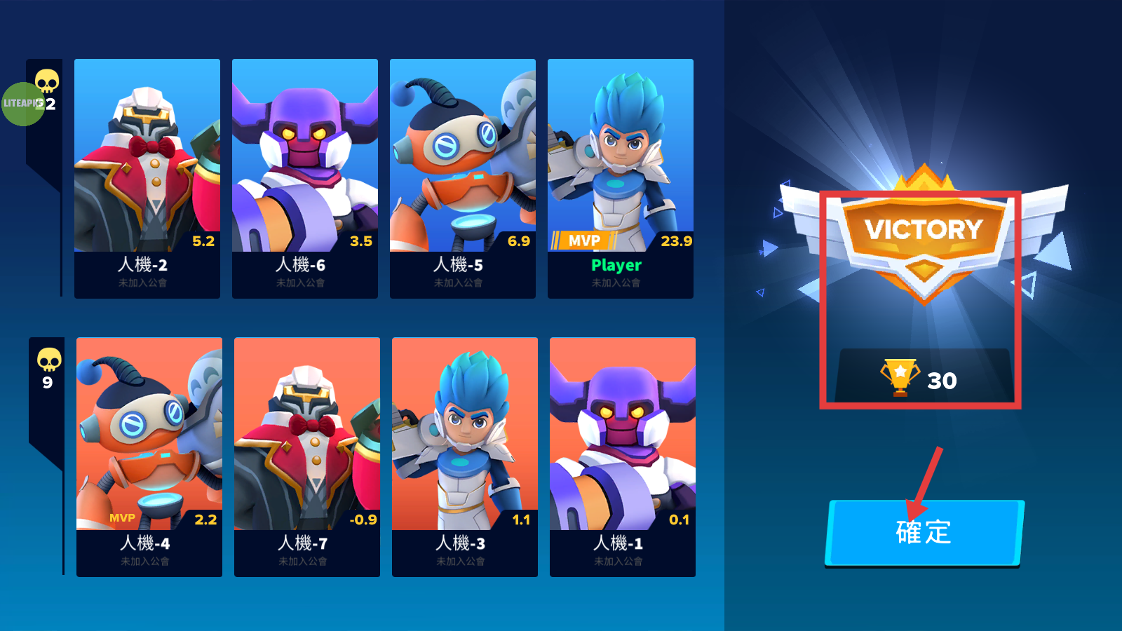 4、战斗胜利后,获得【VICTORY-獎杯30】奖励,点击【確定】按钮结算,积累奖励提升角色实力。