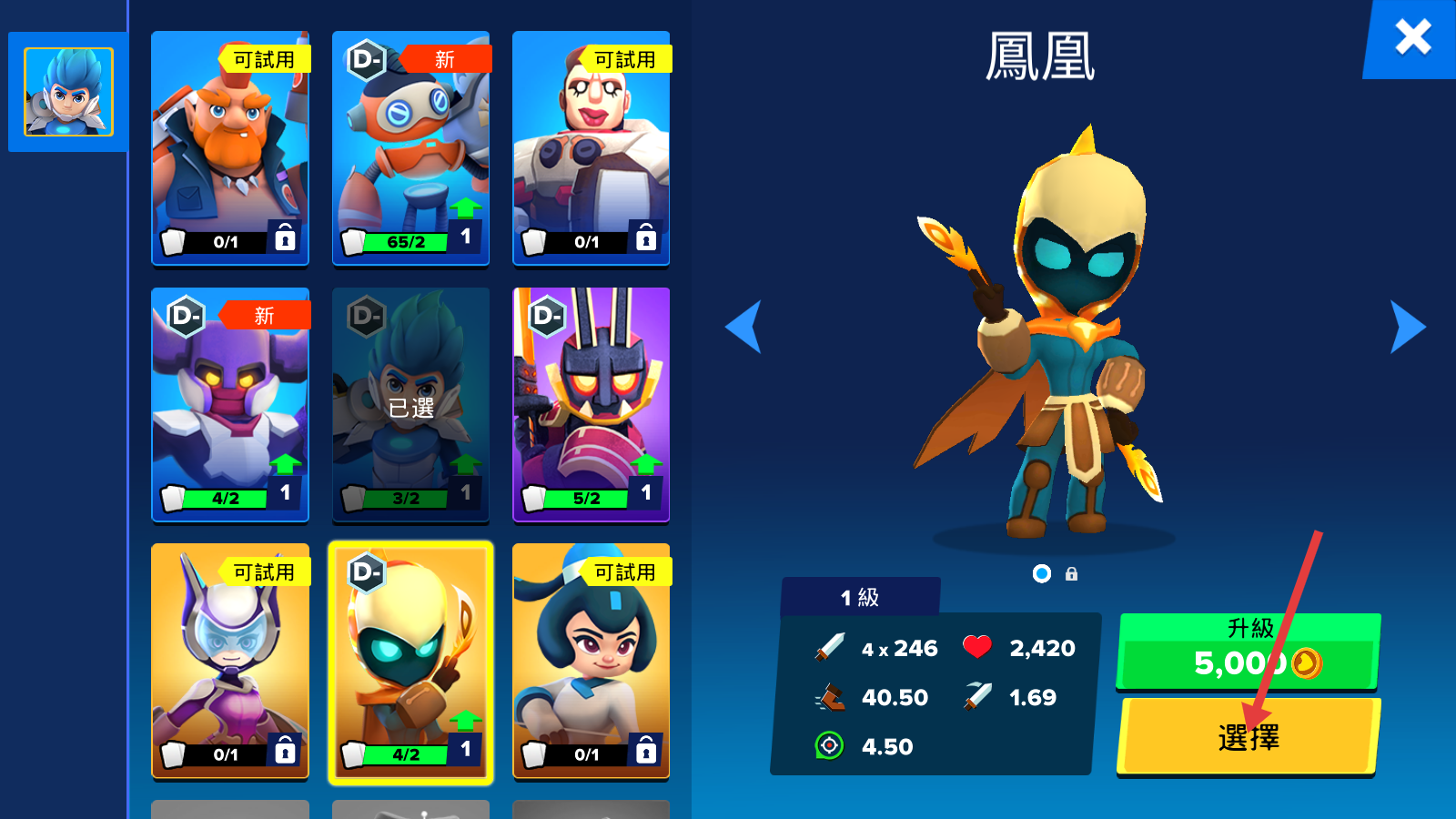 1、选择【鳳凰】角色,可消耗【5,000-金幣】升级,点击【選擇】按钮确认使用该角色参与战斗。