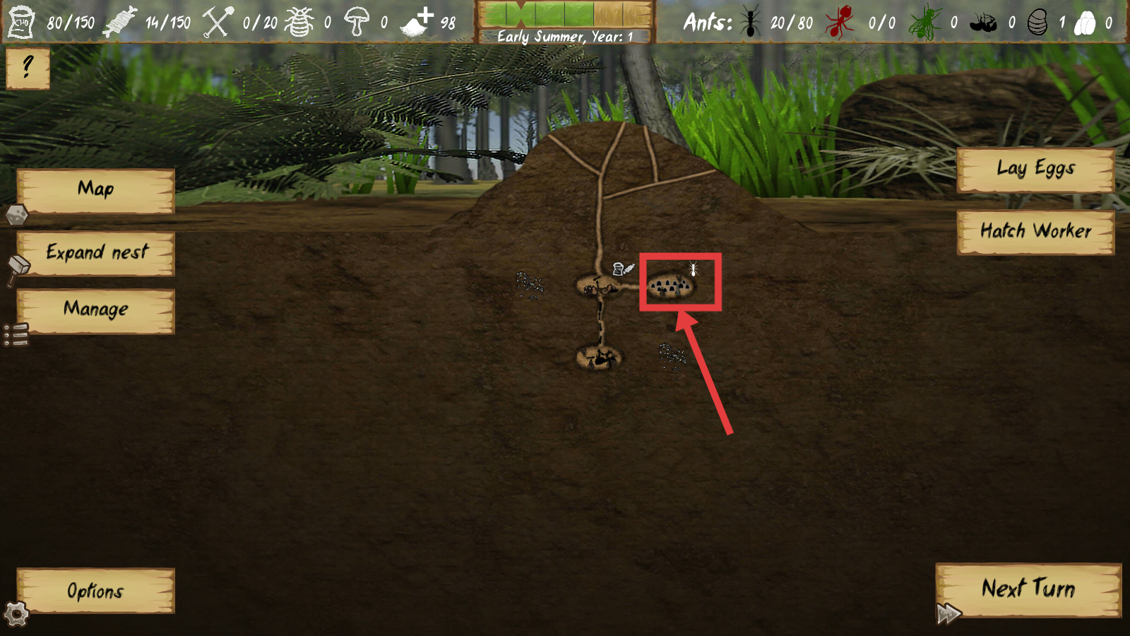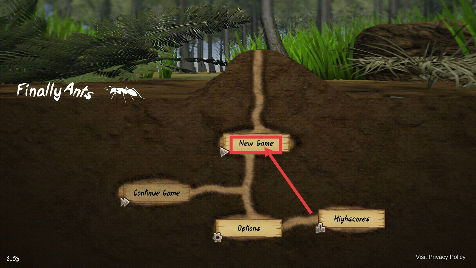 1、开始游戏时,点击【New-Game】开启新档,熟悉【Finally-Ants】的蚁群模拟玩法,从建立初始蚁巢开始发展。