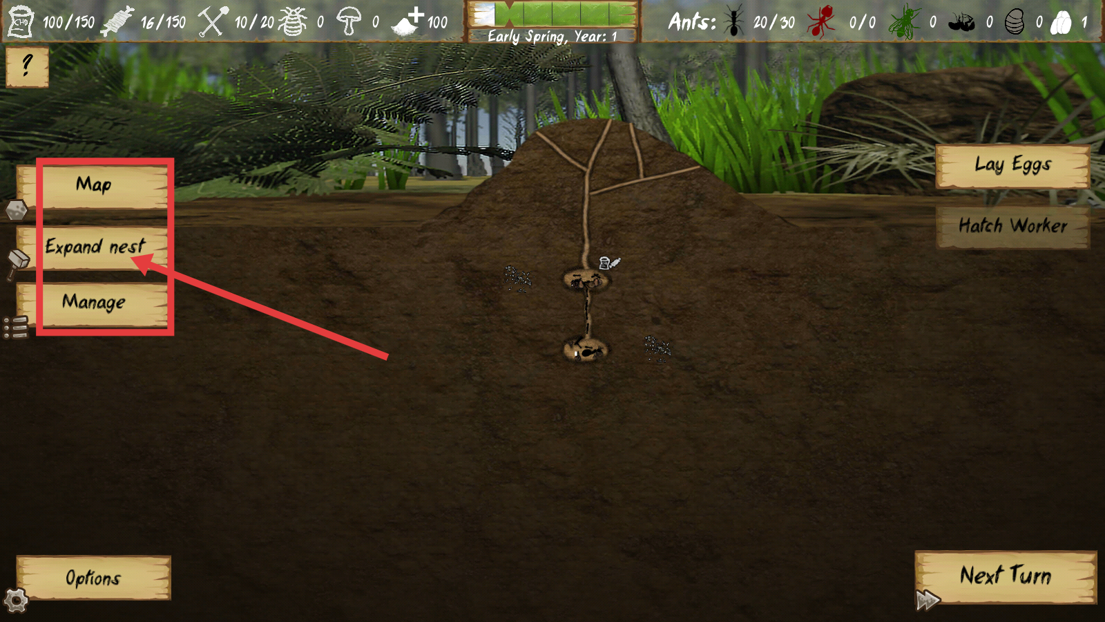 2、进入游戏后,点击【Expand-nest】选项,可进入建筑界面,规划蚁巢的扩张方向,为后续建筑搭建奠定基础。
