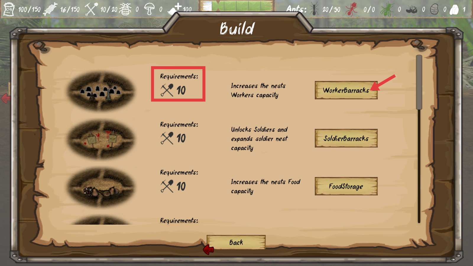 3、在建筑界面中,优先凑齐【10】把工具,建造【Workerbarracks】,提升工蚁容量,让蚁群采集和建设效率大幅提升。