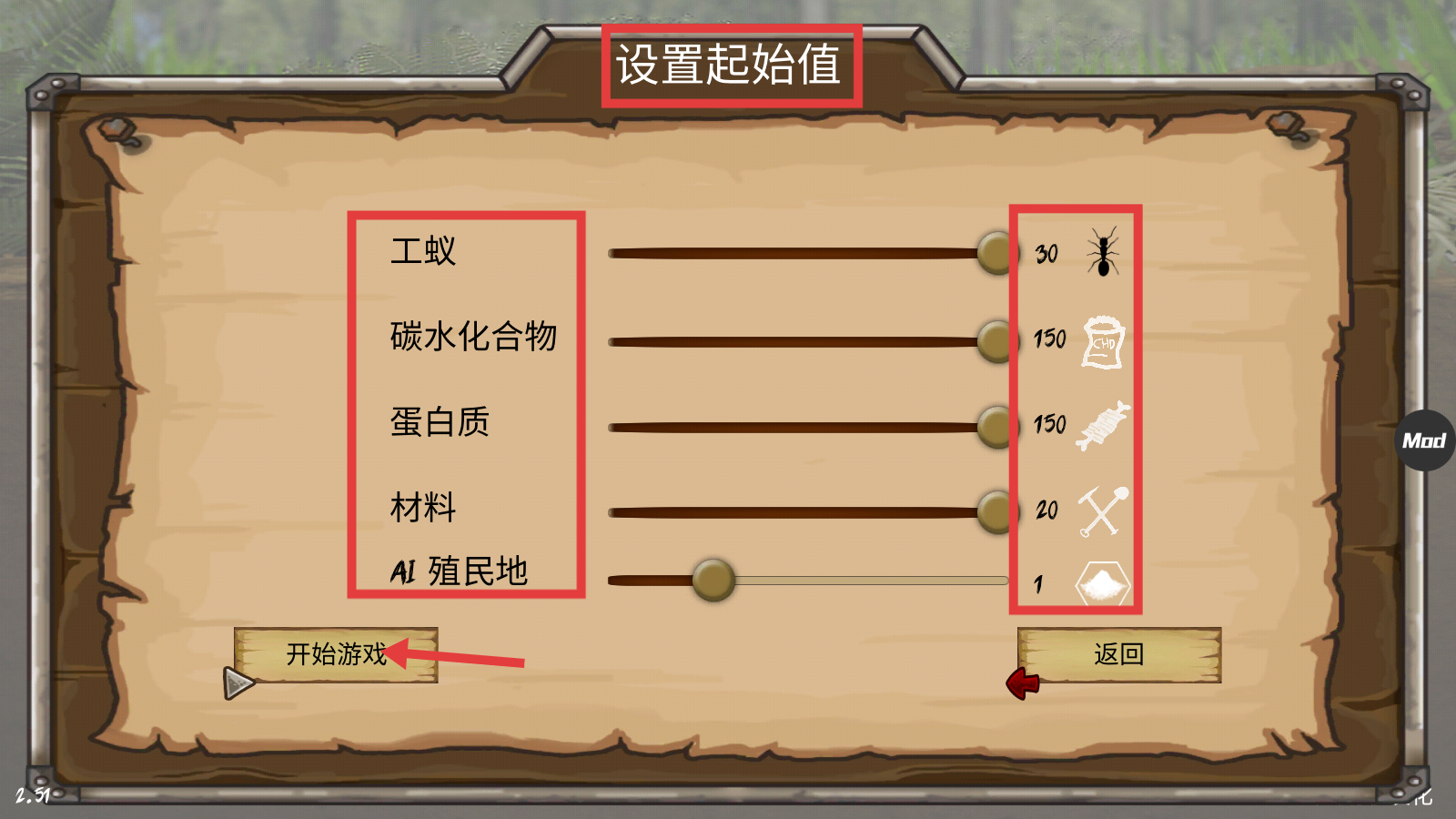 1、在【设置起始值】界面,调整【工蚁】【碳水化合物】【蛋白质】等参数后,点击【开始游戏】,完成蚁群模拟的开局配置。