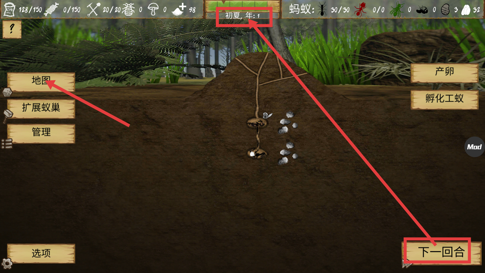 2、进入游戏后,点击【地图】,关注【初夏-年:1】的时间进度,点击【下一回合】推进游戏进程,逐步发展蚁群。