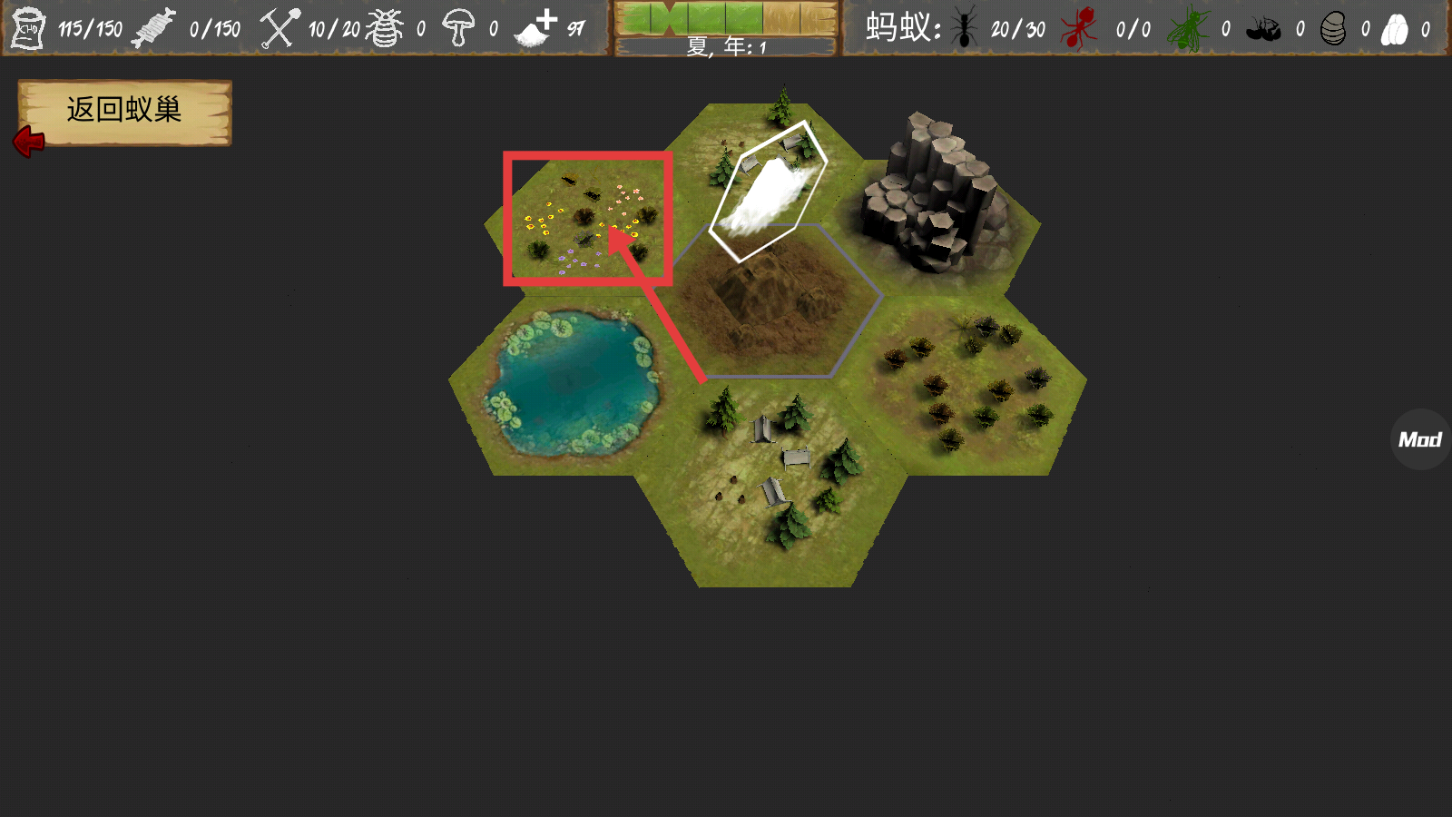 3、在地图界面中,选择有花朵的区域,派遣工蚁前往探索,获取资源,为蚁巢扩张和发展积累物资。