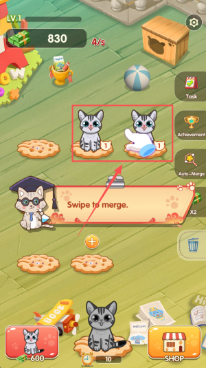 1、首先,通过滑动屏幕来合并相同的猫咪,以解锁更高级的猫咪。