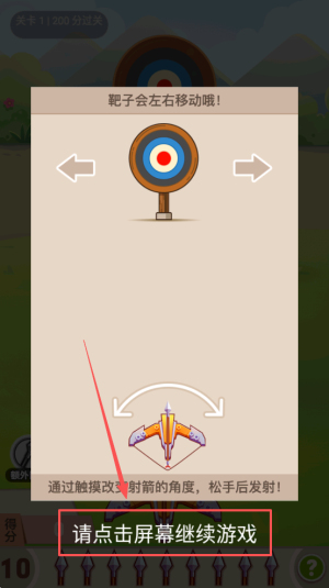 2、接着,阅读游戏教程,了解如何通过触摸屏幕调整射箭的角度,然后松手发射。