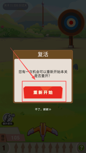 4、最后,如果箭没有射中目标,可以选择点击“重新开始”按钮重试本关。