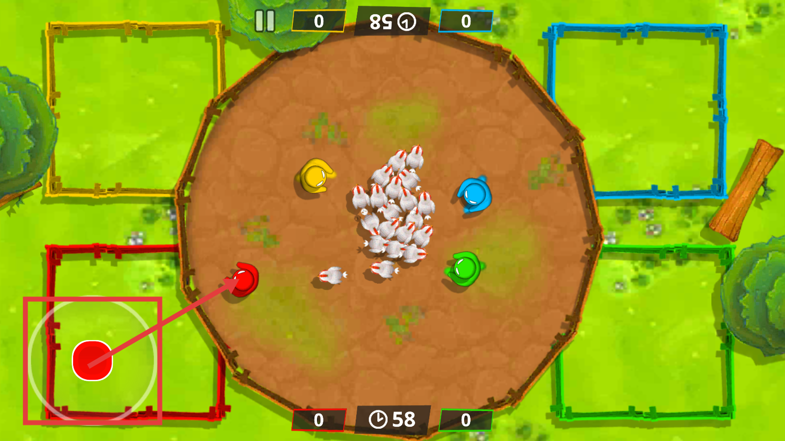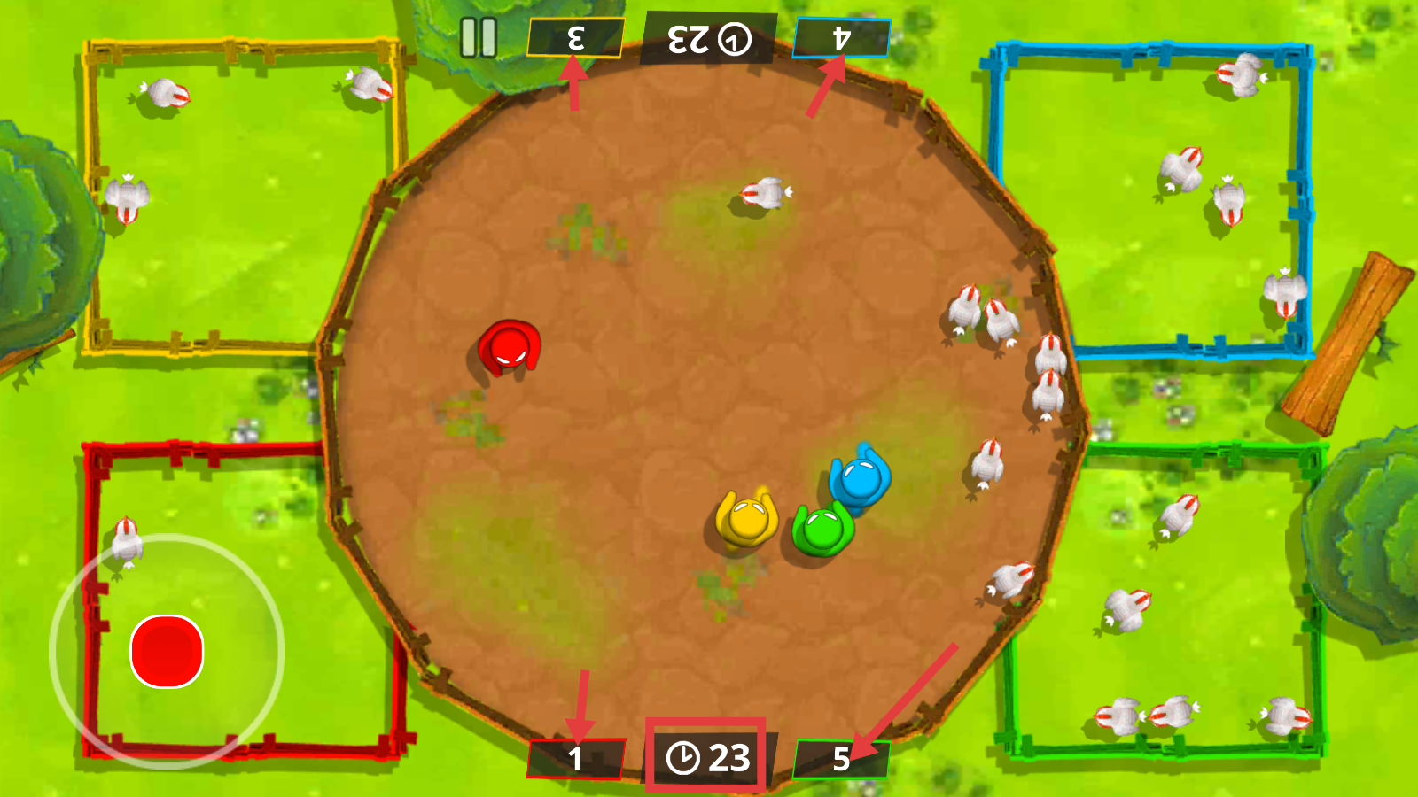 1、操控左侧红色按钮,控制【红色角色】移动,收集中间的小鸡,为自己的区域积累资源。