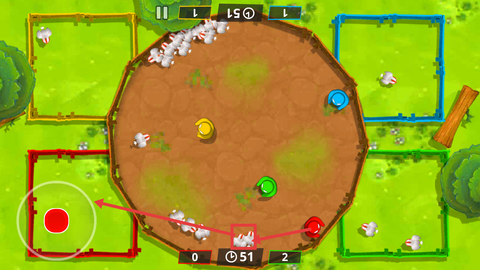 2、继续操控【红色角色】,将小鸡引导至红色区域,关注时间【51】和小鸡数量,扩大资源优势。