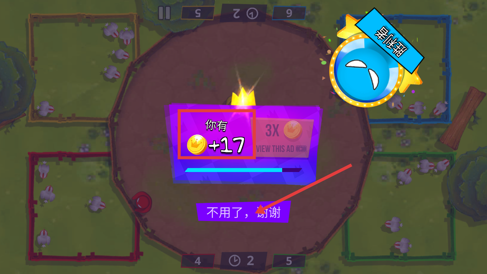 3、留意各区域小鸡数量,如【3】【4】【1】【5】,合理分配收集时间【23】,争夺更多小鸡。