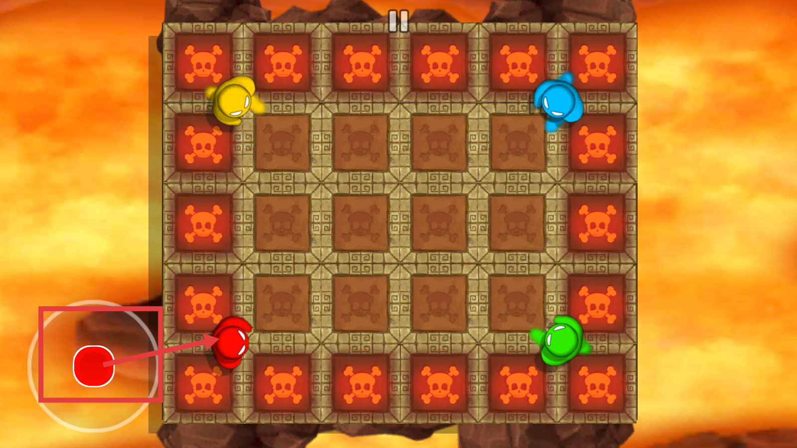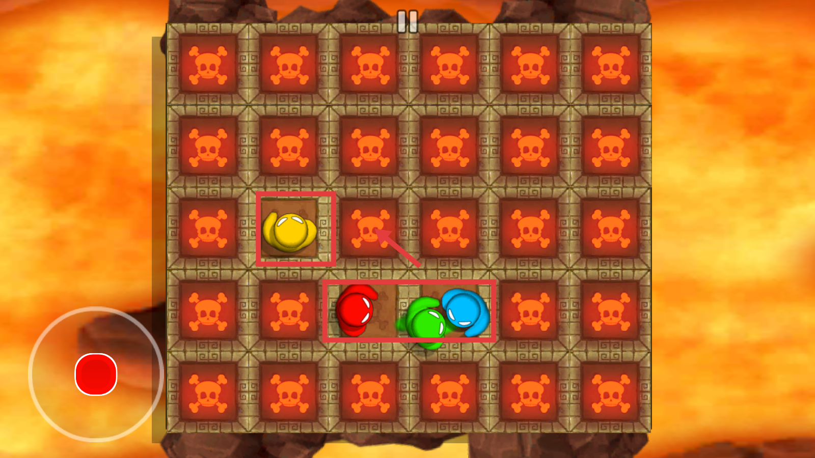 1、操控左侧红色按钮,控制【红色角色】移动,避开带骷髅的危险格子,规划安全路线,开始生存挑战。