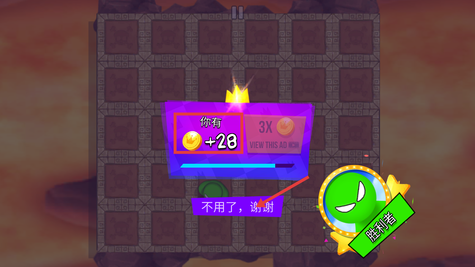 4、获胜后获得【+28-金币】奖励,看到胜利者标识,点击【不用了,谢谢】,继续挑战下一局。