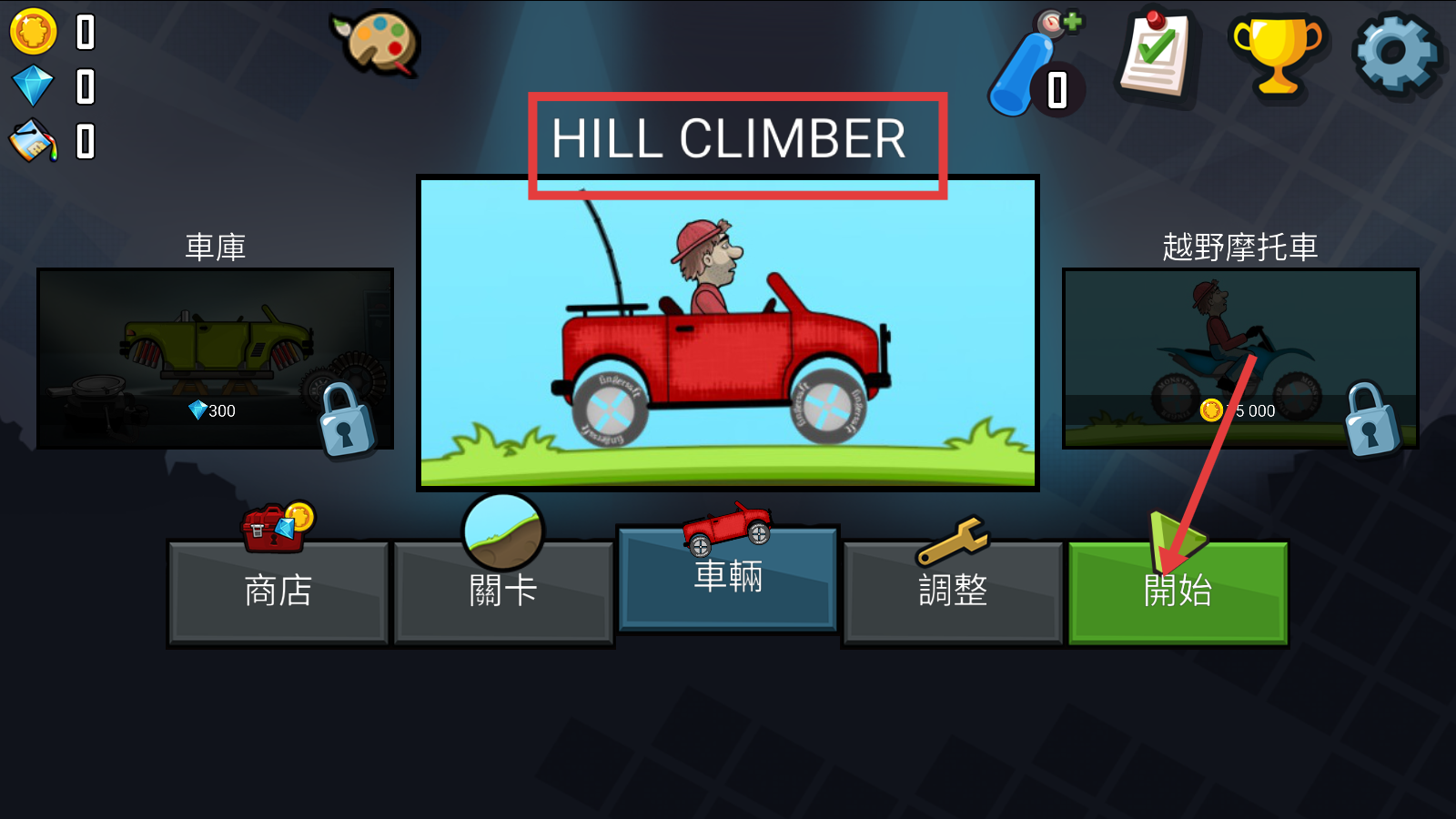 1、进入游戏后选择【HILL-CLIMBER】车辆,点击【開始】按钮开启爬坡挑战。