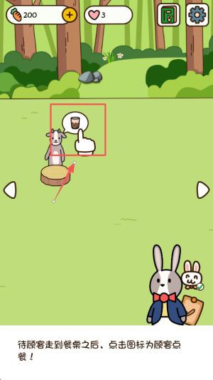 2、接待动物顾客:迎接森林中的小动物(如小兔子),根据它们的口味需求制作对应甜品,提升顾客满意度以赚取更多胡萝卜。