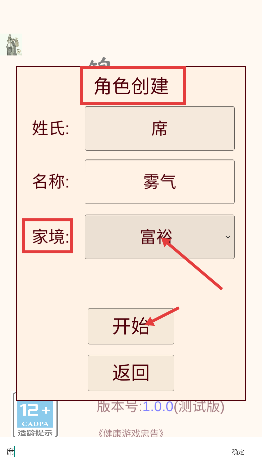 1、进行【角色创建】时,可选择【家境-富裕】,填写姓氏名称后点击【开始】,进入游戏开启锦衣卫生涯。