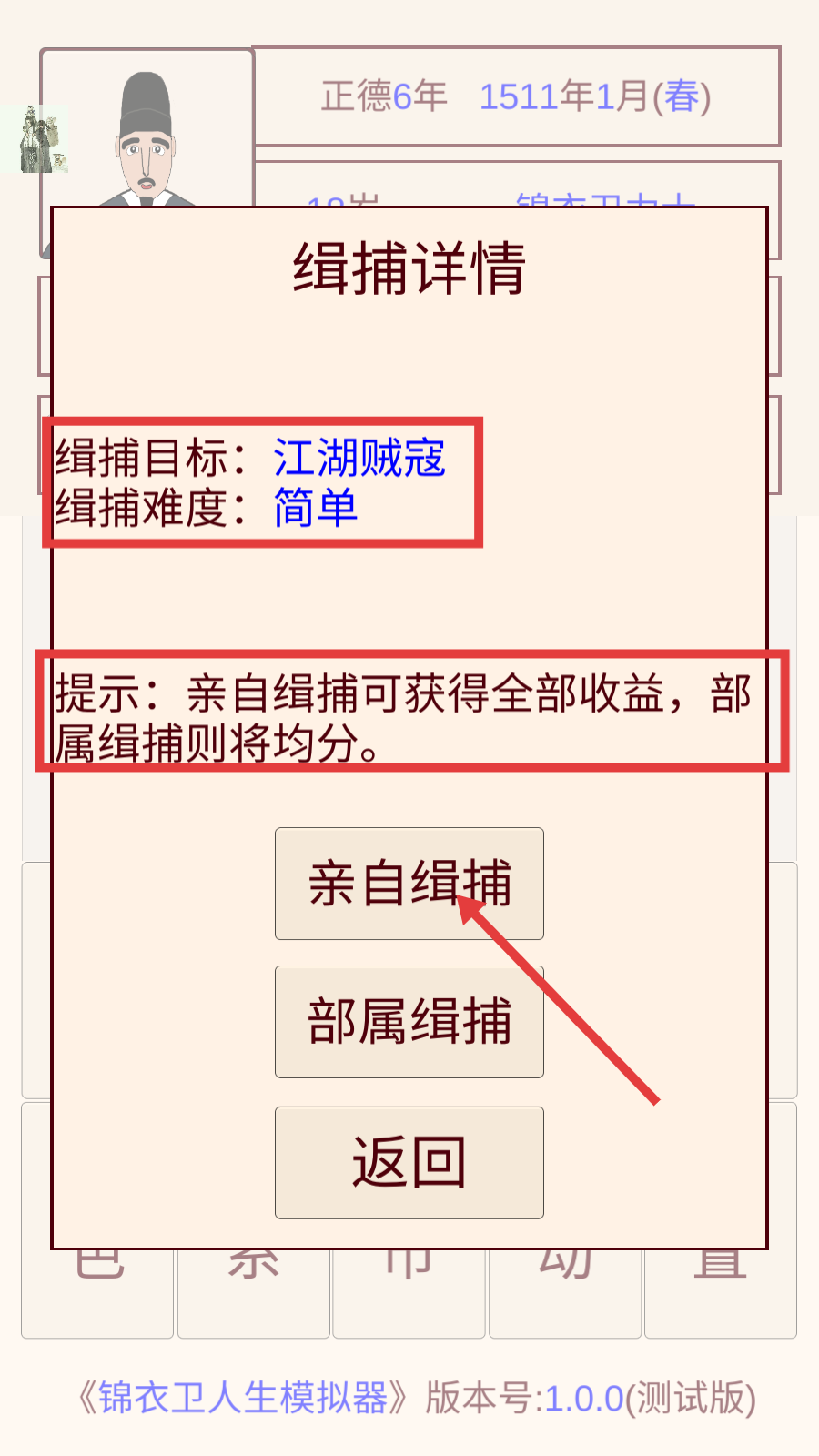 3、在【北镇抚司】中选择【缉捕】任务,需注意部属健康值不可低于20,同时关注派系关系避免被弹劾。
