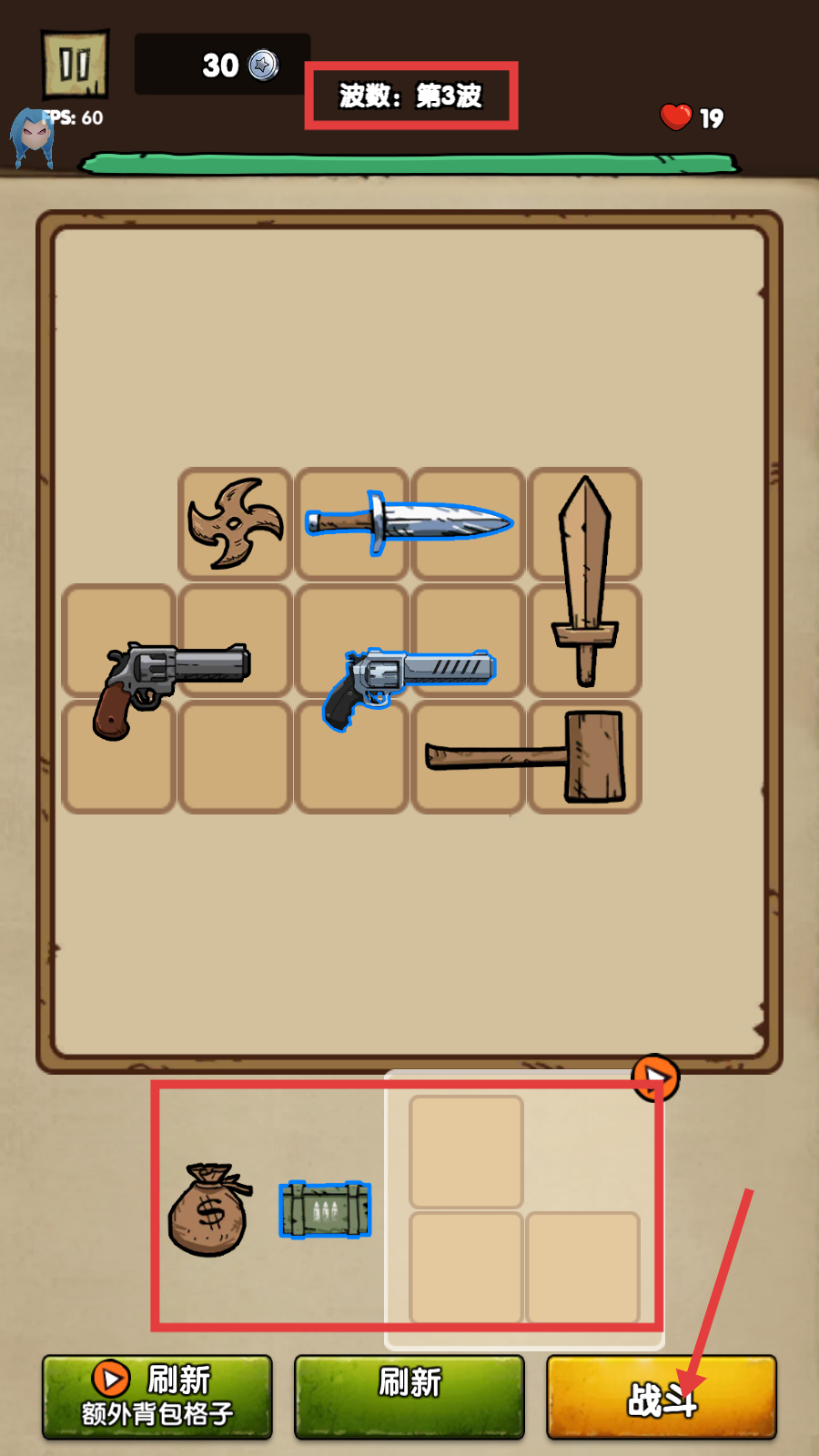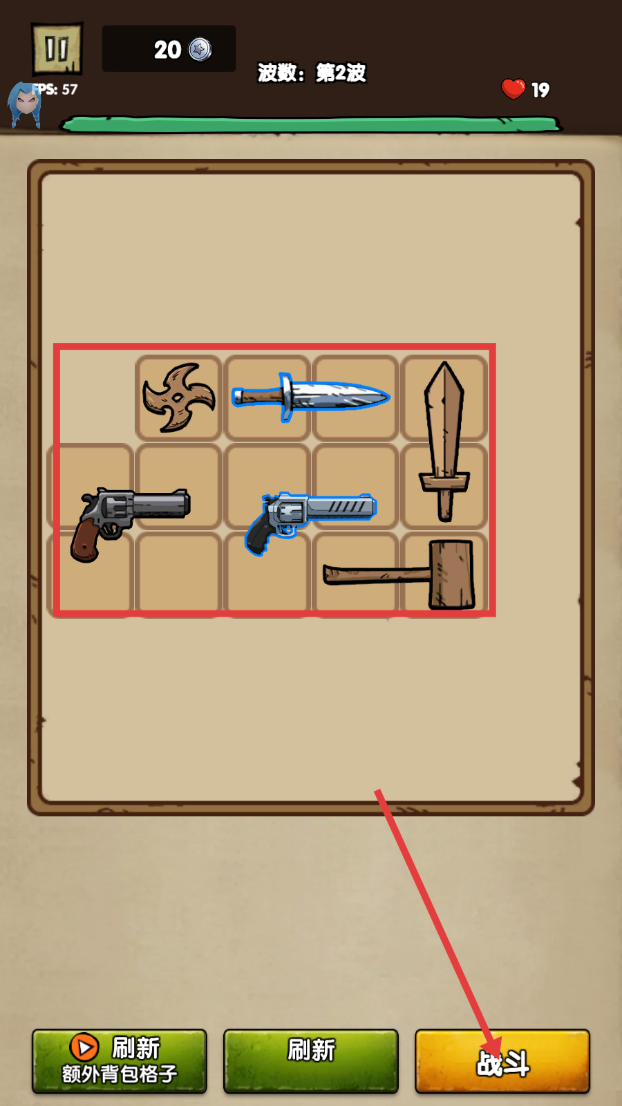 1、武器栏中有多种武器,点击【战斗】按钮,进入第2波战斗,继续推进关卡。