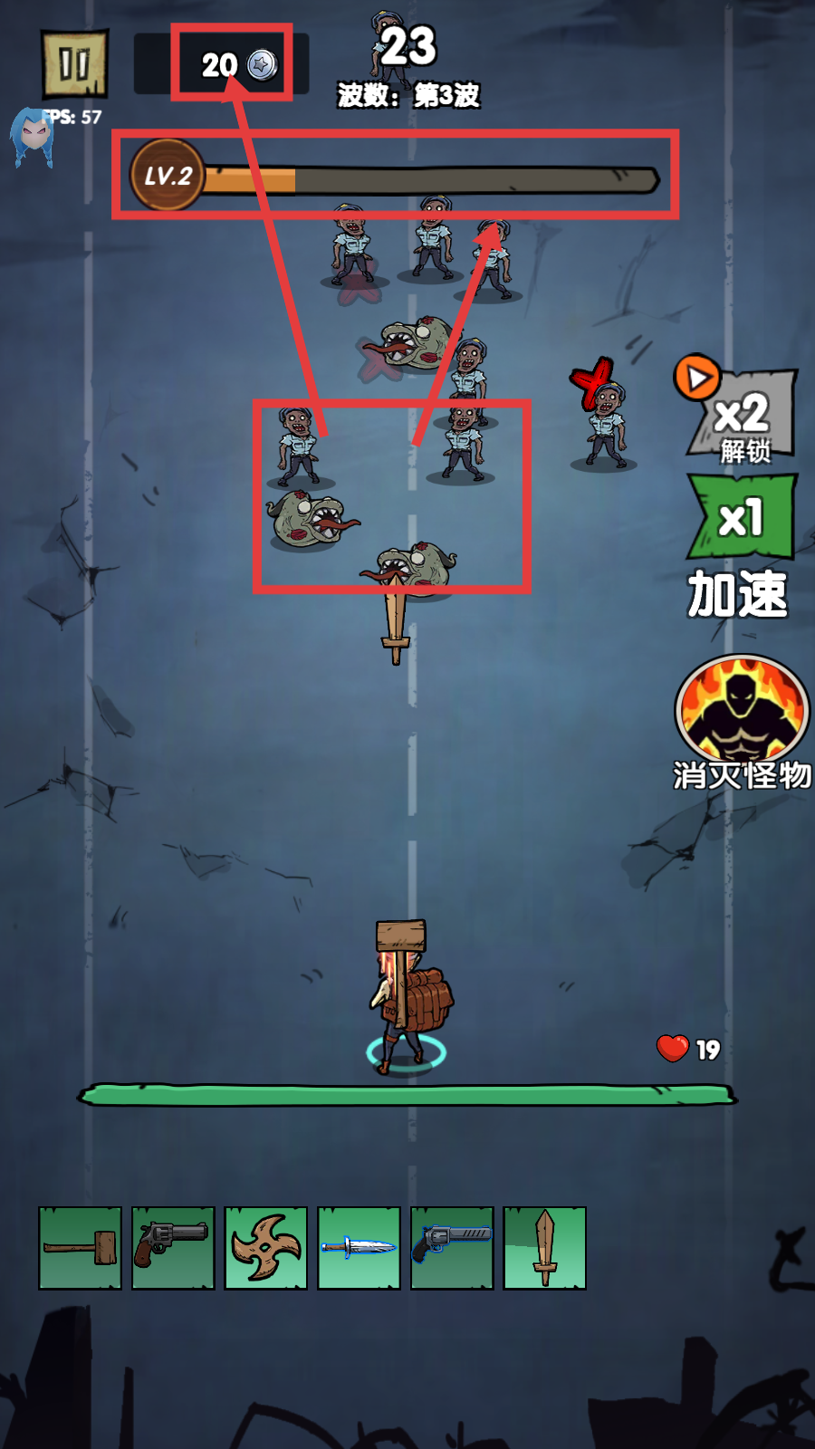 2、战斗中升级到【LV.2】,获得【20-银币】,击杀敌人积累资源与经验,提升自身战力。