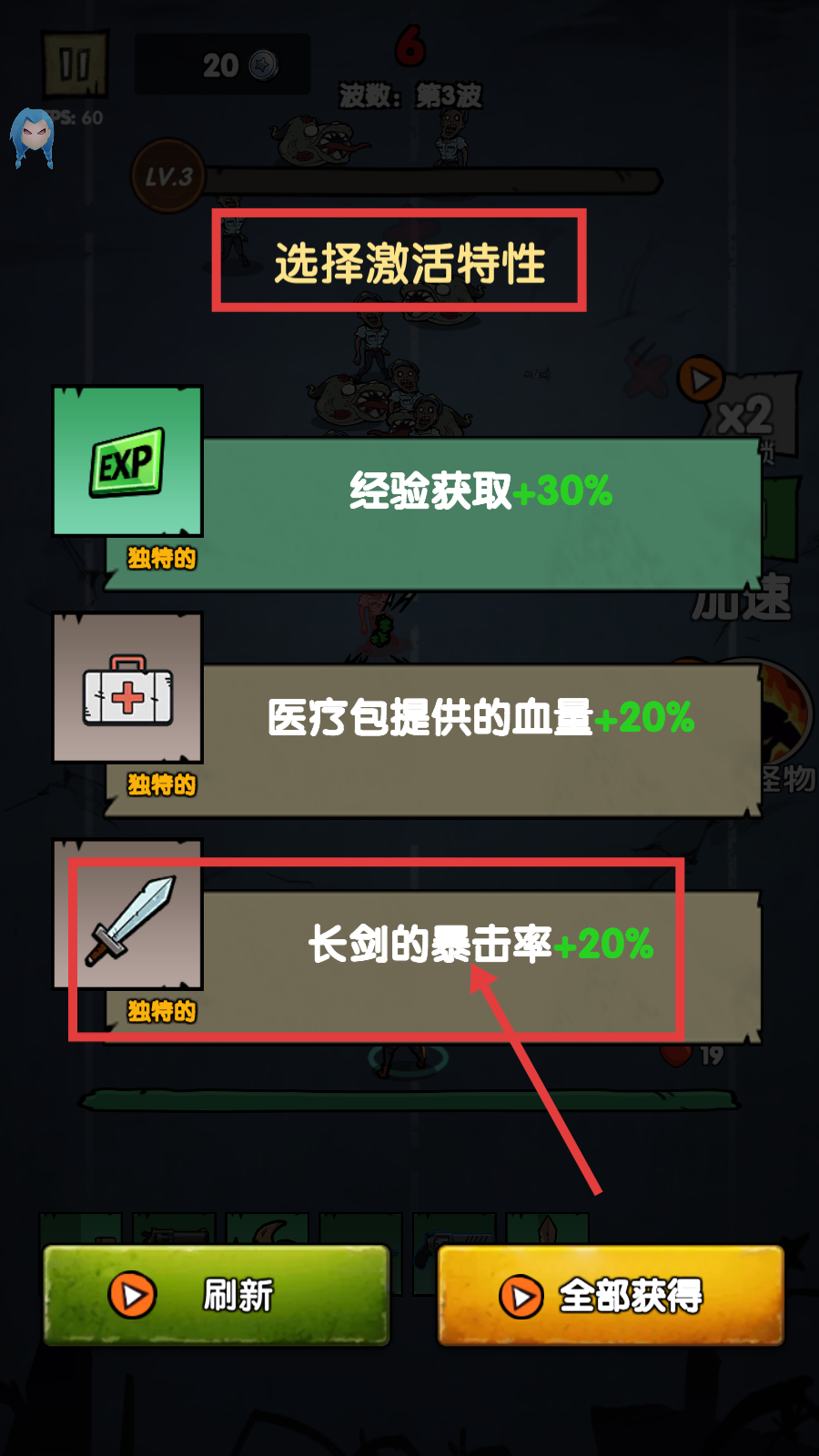 3、选择激活特性时,优先选【长剑的暴击率+20%】,增强长剑伤害,助力后续战斗。