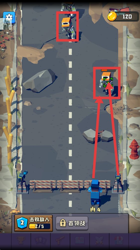 1、关注【击败敌人-2/5】进度,优先攻击路上敌人,积累进度同时获取【120-金币】。