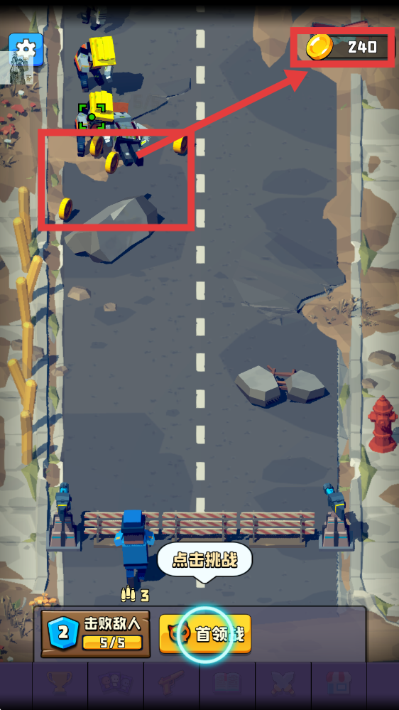 2、完成【击败敌人-5/5】后,金币增至【240】,点击【首领战】挑战首领,获取丰厚奖励。